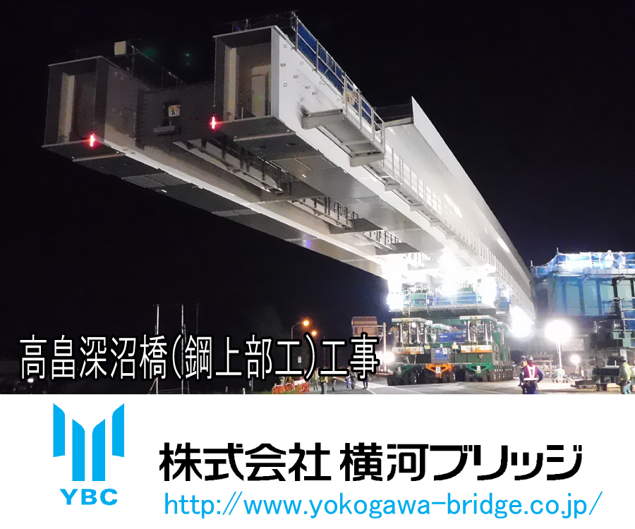 同橋の架設は上り線A1~P3間、下り線A1~P2間が完了しており、17日夜からは下り線P2~P3間(J16~J29)の架設を行った。架設桁は桁長101.6m、鋼重678.5tで、昨年10月から国道13号脇のヤードで地組したが、冬期を跨いだために地組桁の除雪作業を行うなど苦労の多い作業となった。