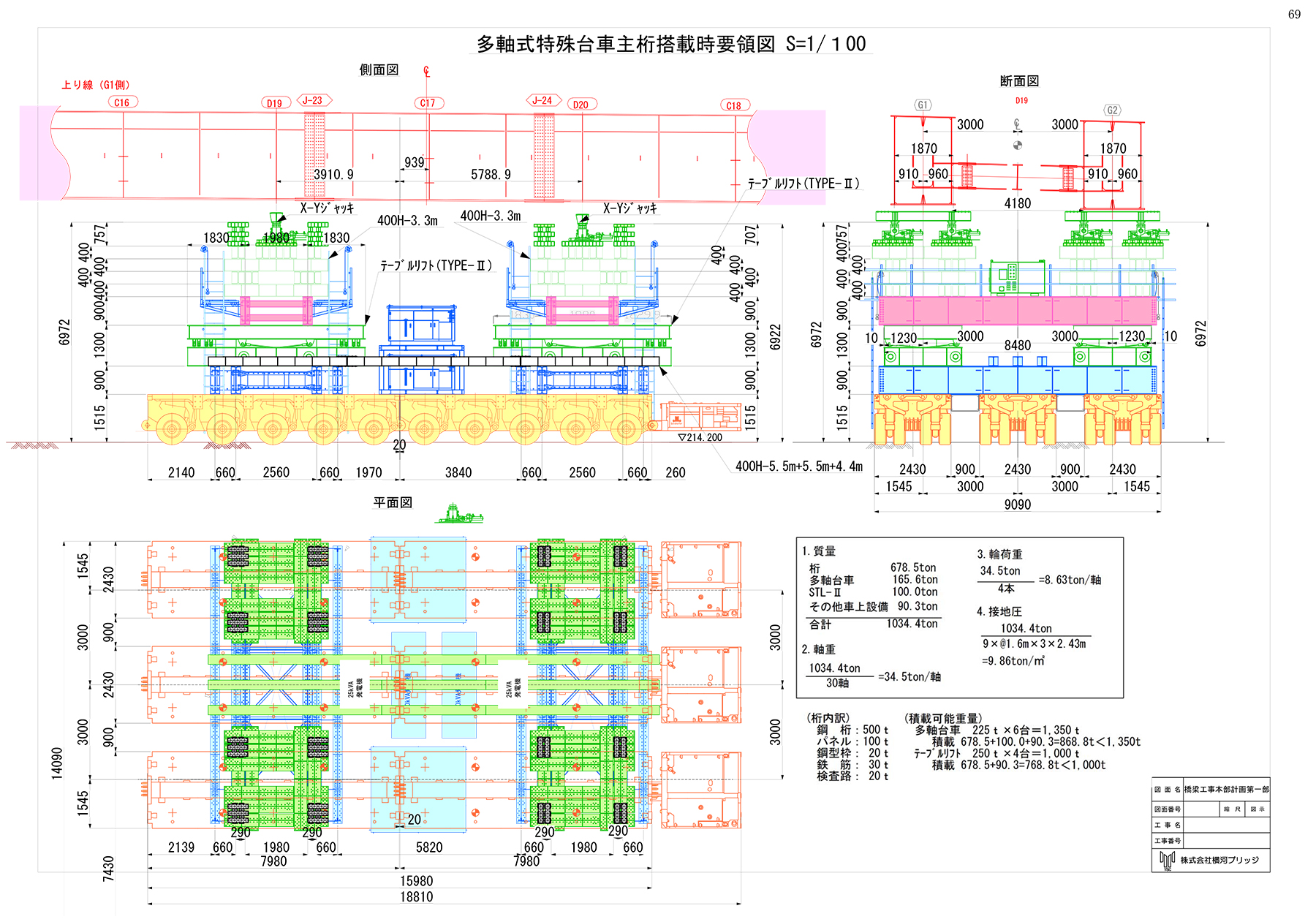 1台あたりの最大積載能力は224.8tで6台では1,348.8tとなり、積載重量比を約50%に抑制して安全性を確保している。台車上には1台あたり250tの昇降能力を有する「スーパーテーブルリフトⅡ」を4セット搭載して、迅速な昇降作業を可能にした。