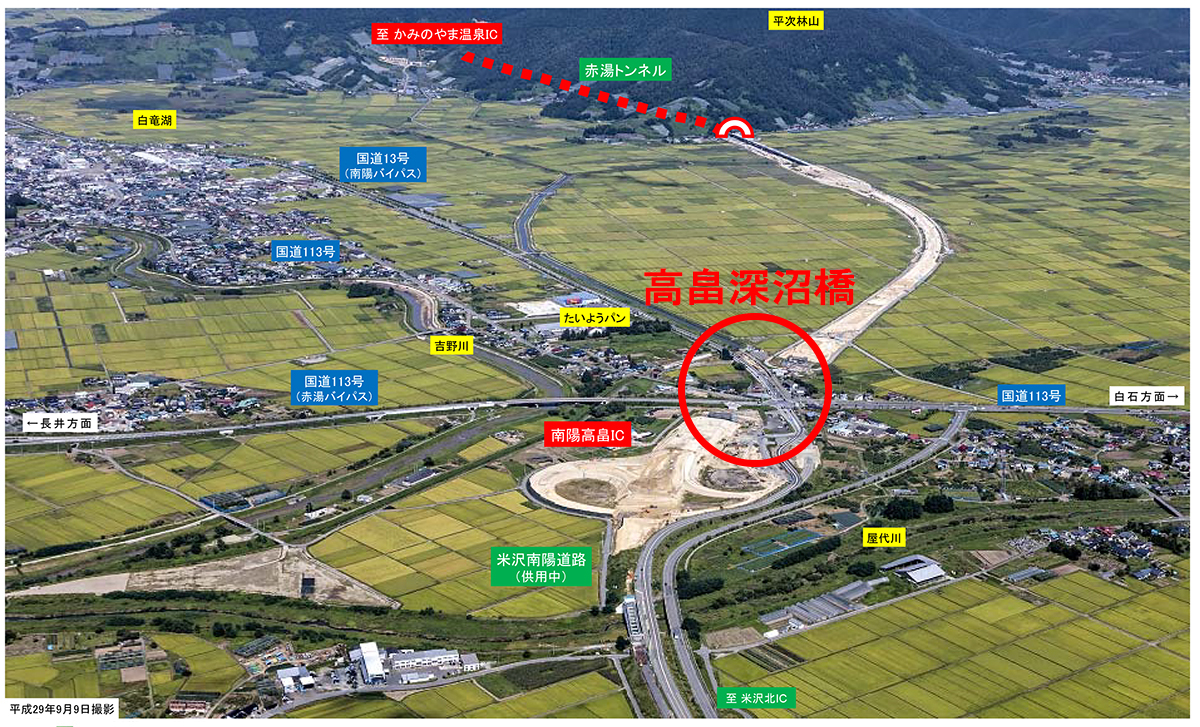 同橋は南陽高畠ICの北側に位置する橋長302.6m、有効幅員10.75mの鋼4径間連続合成細幅箱桁橋で、国道13号、113号、町道蒲原舟入1号線と交差している。