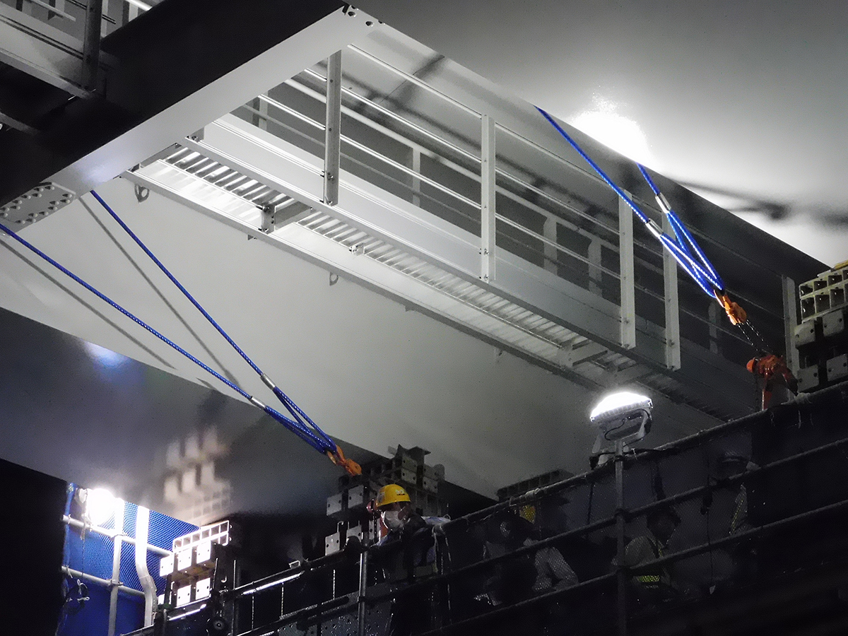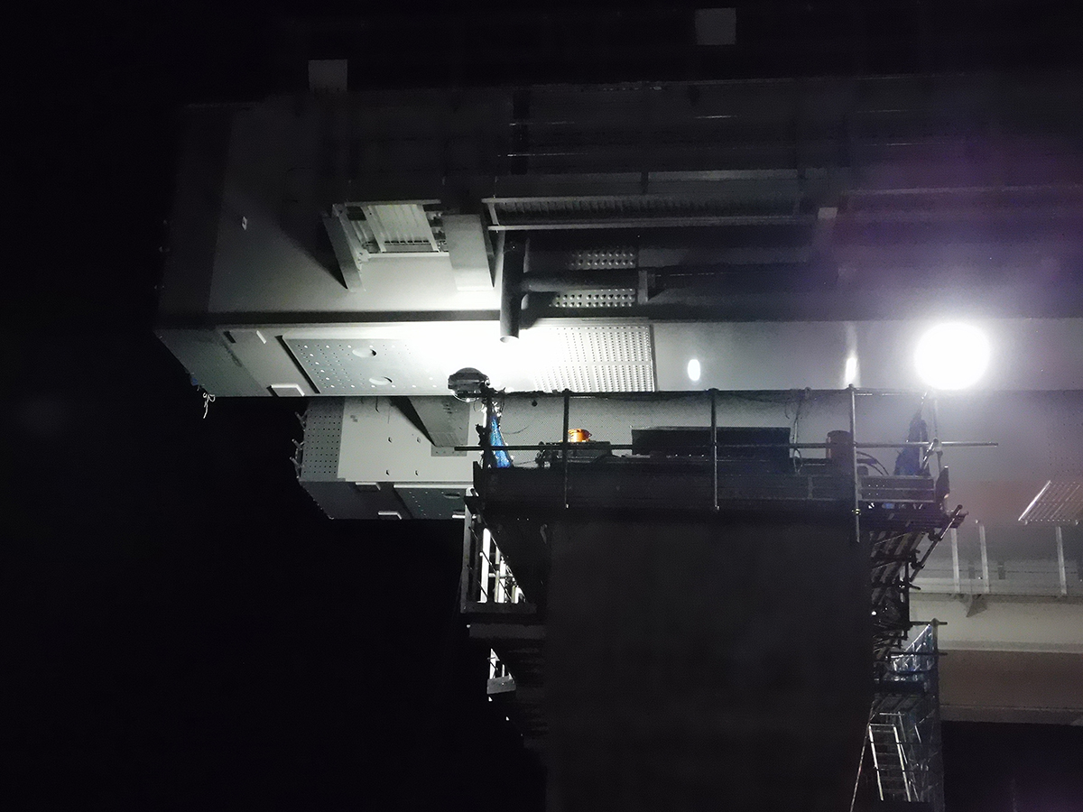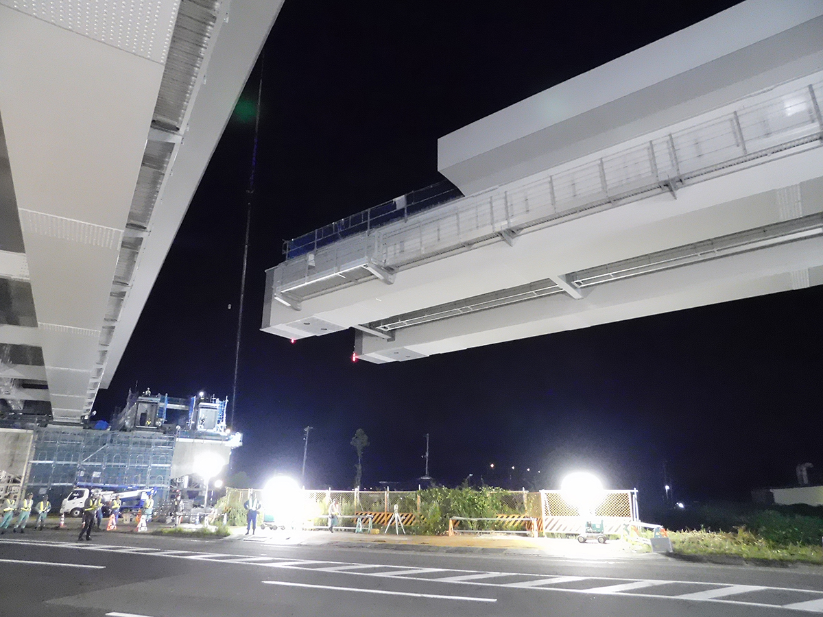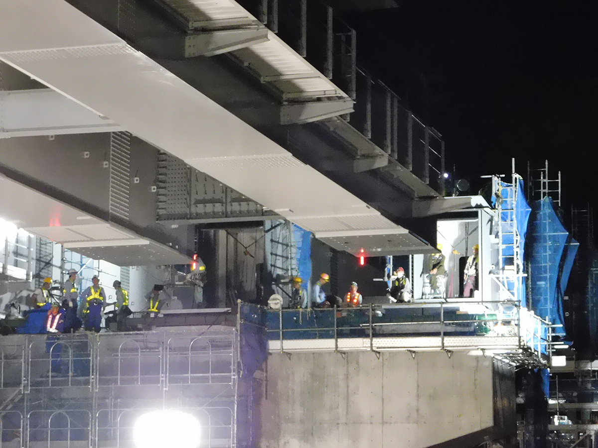 9時半過ぎからテーブルリフトを50cm、28cm、19cmと段階的に降下させ、仕口調整に入っていった。添接作業はP2側(J16)で11時半過ぎから開始して、午前0時過ぎに完了。午前2時20分には、予定の午前6時より3時間40分早く交通規制を解除した。順調に架設が完了したのは、「前週(9日夜~10日未明)に同じように施工した上り線(P2~P3間)架設の経験を生かすことができた」(NEXCO東日本)からだった。