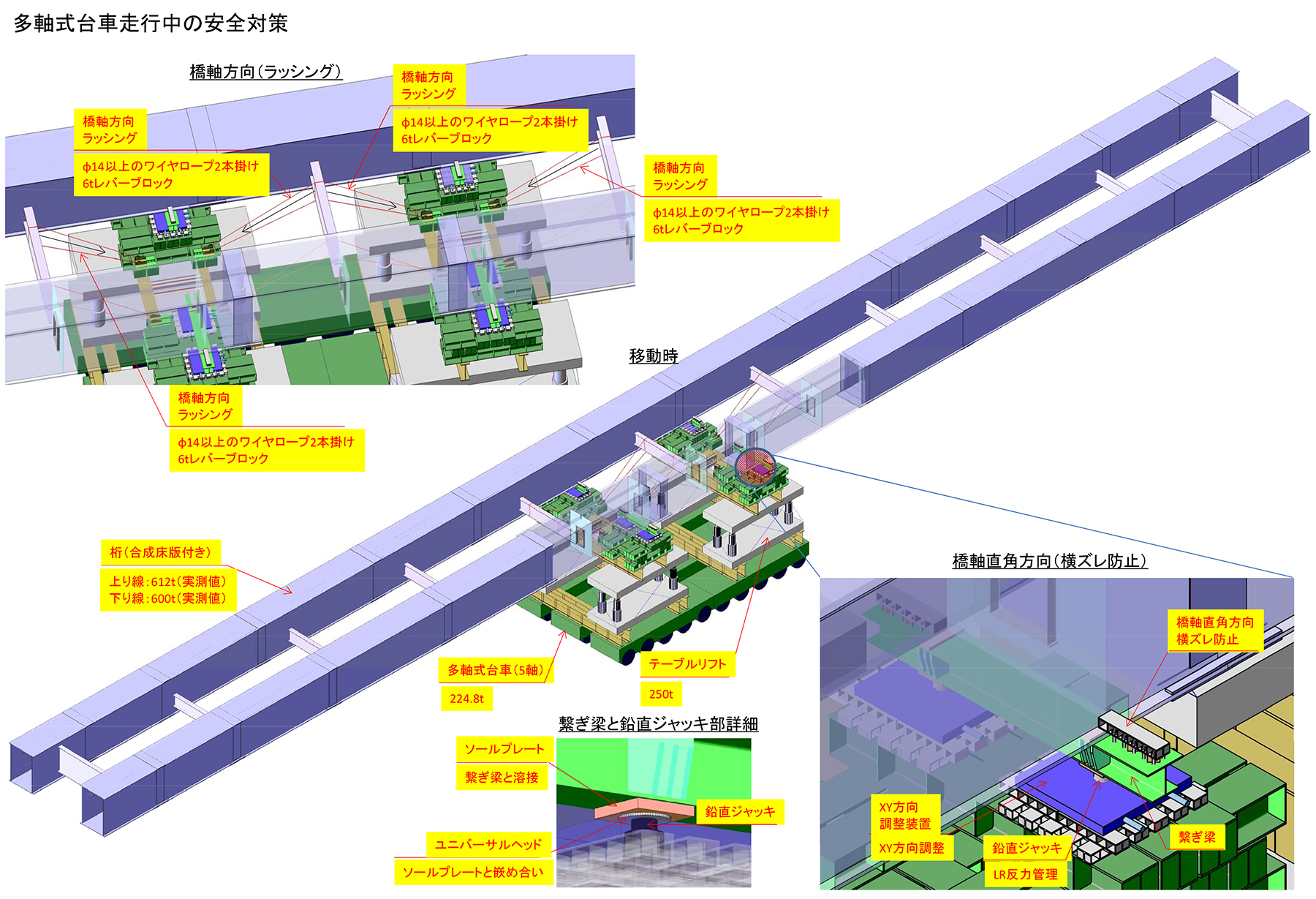 多軸式特殊台車の移動速度は最高2.2m/分~最低0.4m/分で、ヤードから架設位置までの108mを移動する。NEXCO東日本と元請の横河ブリッジでは架設にあたり想定されるあらゆるリスクを管理表としてまとめ、台車が止まった場合に備えて整備士を配置しておく、ジャッキ故障では油圧ホースの切断も想定されるため予備油圧ジャッキを配置しておくなどの対策を取った。多軸式特殊台車走行時の安全対策では、橋軸方向に合計8本のワイヤロープを台車と桁にかけるラッシングを行うとともに、横ズレ防止としてサイドストッパーを橋軸直角方向に4箇所設置している。