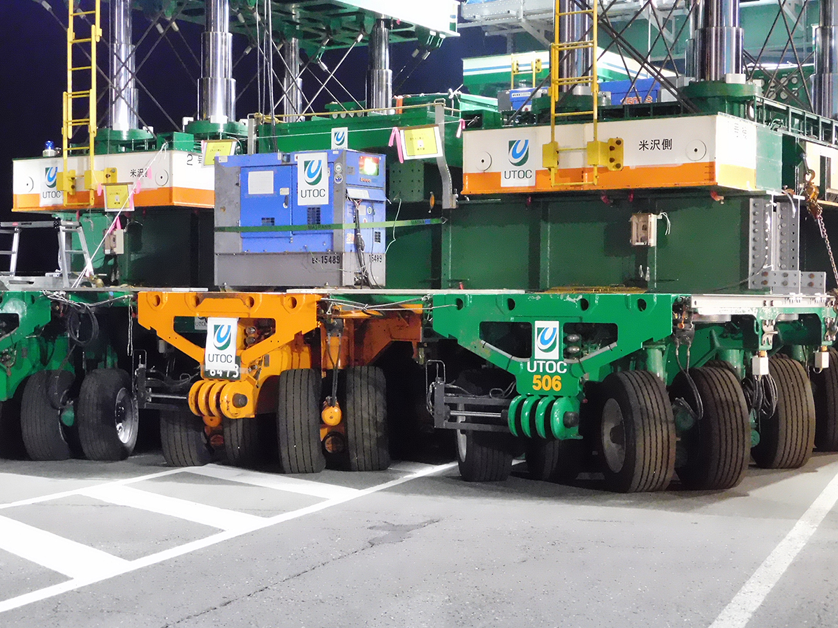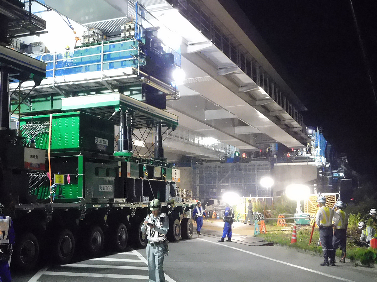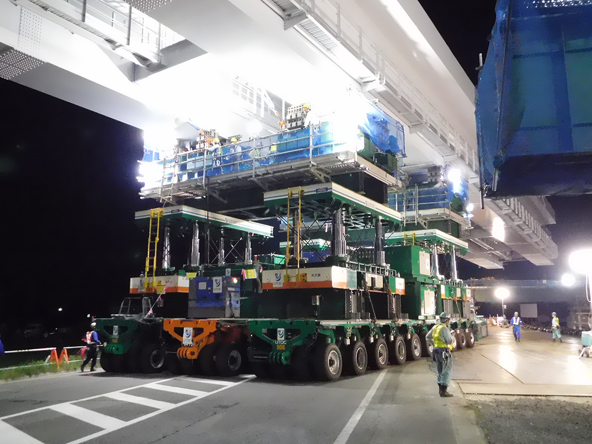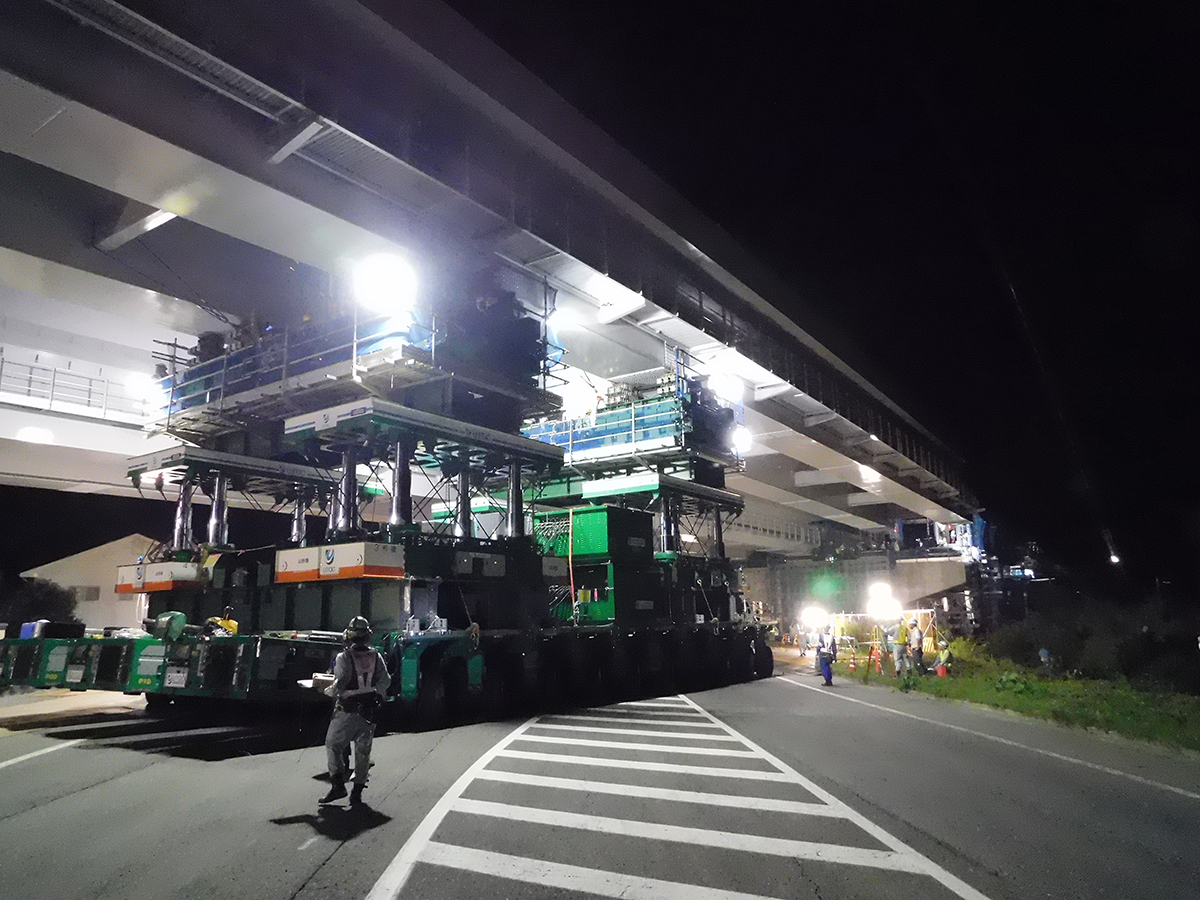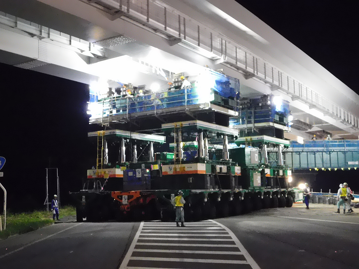 施工は午後8時に国道13号の交通規制を開始し、規制が完了した8時20分ごろに多軸式特殊台車が時計回りに9.5m旋回して国道上に進入。8時半過ぎに20m前方に移動した。