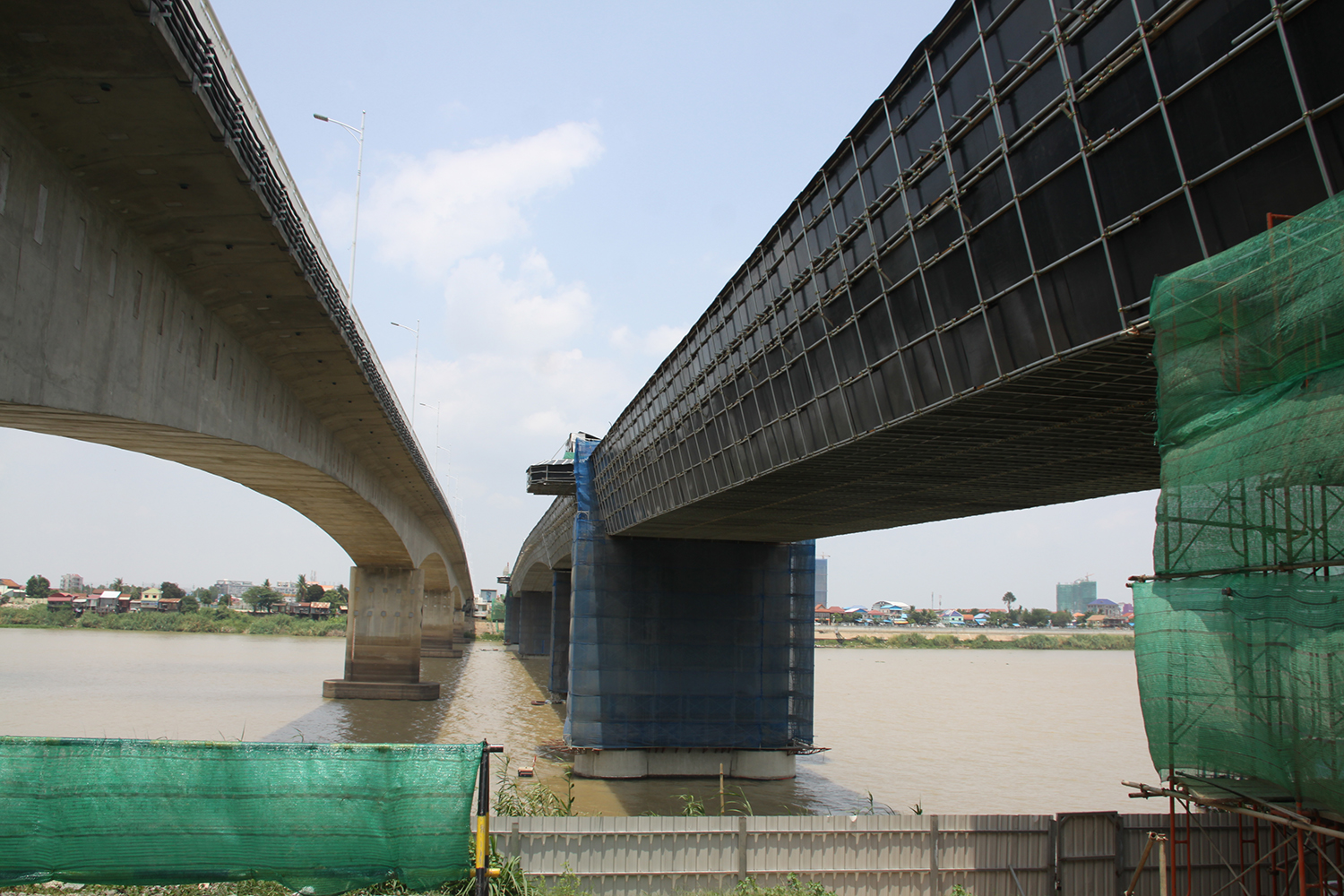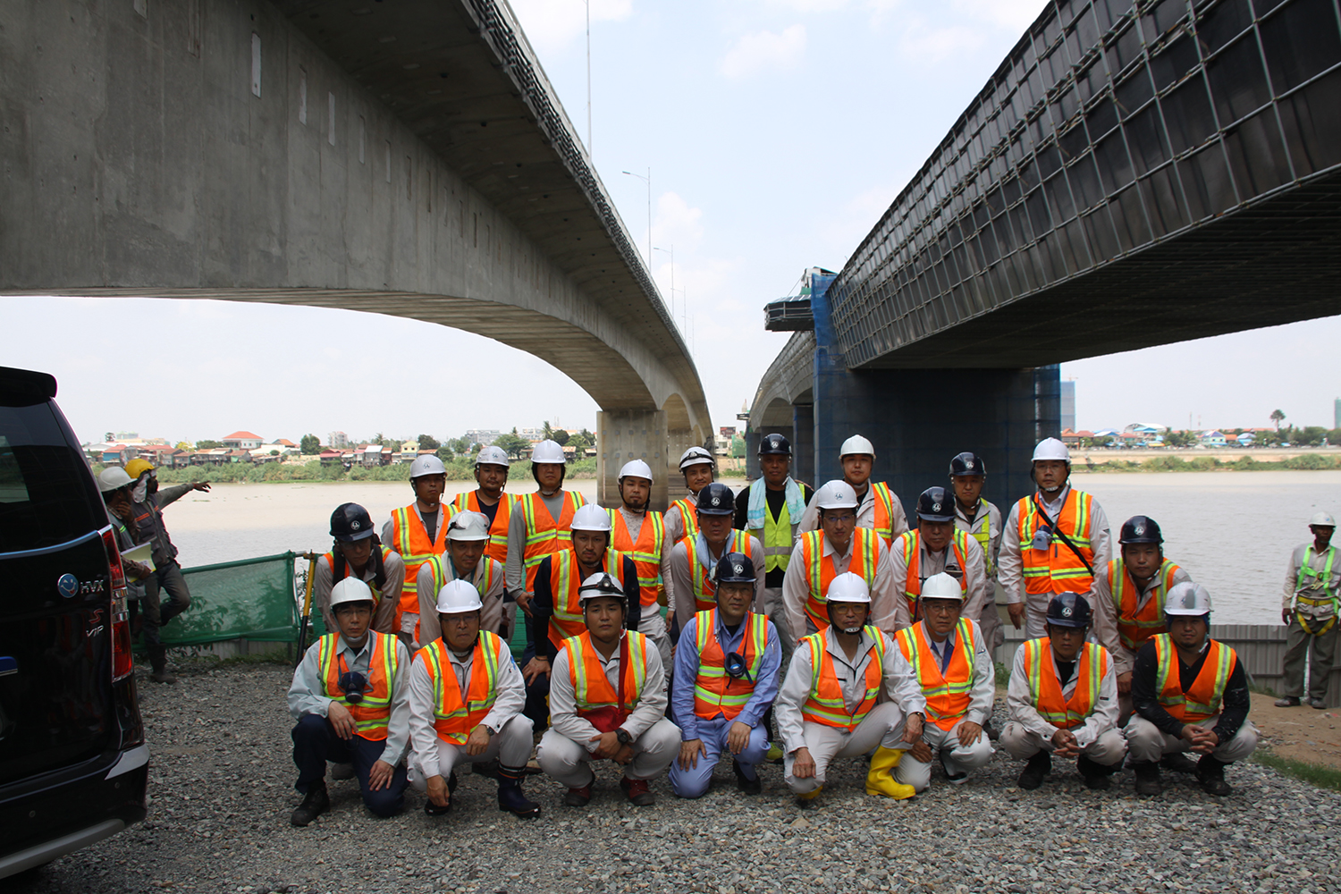 現場には翌日のお昼過ぎに赴いた。さすがに熱帯だ、熱い。午前中に現場についてのレクを受けた事務所からチュルイ・チョンバー橋まではそれほど離れていないのだが、1日中ラッシュアワー状況で、速度は20~30kmほどしか出せず、時間的距離は遠く感じる。中でも同橋付近はボトルネックになっており、4車線の中国がかけたPC橋はあるが、交通需要に比して需要は足りおらず。速やかな「日本橋」の開通が求められている。