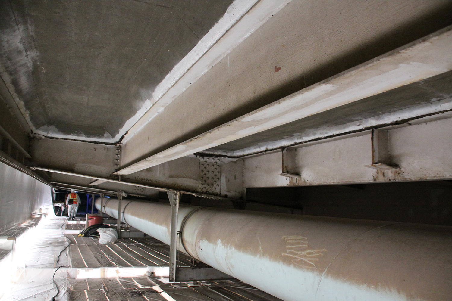 さて、現場はPC橋の旧橋がほぼ撤去されていた。鋼橋については塗装の塗り替えが進んでいた。鋼橋総延長のうち約3分の1の部分についてブラストが完了し、追いかけるように塗り替えを行っていた。