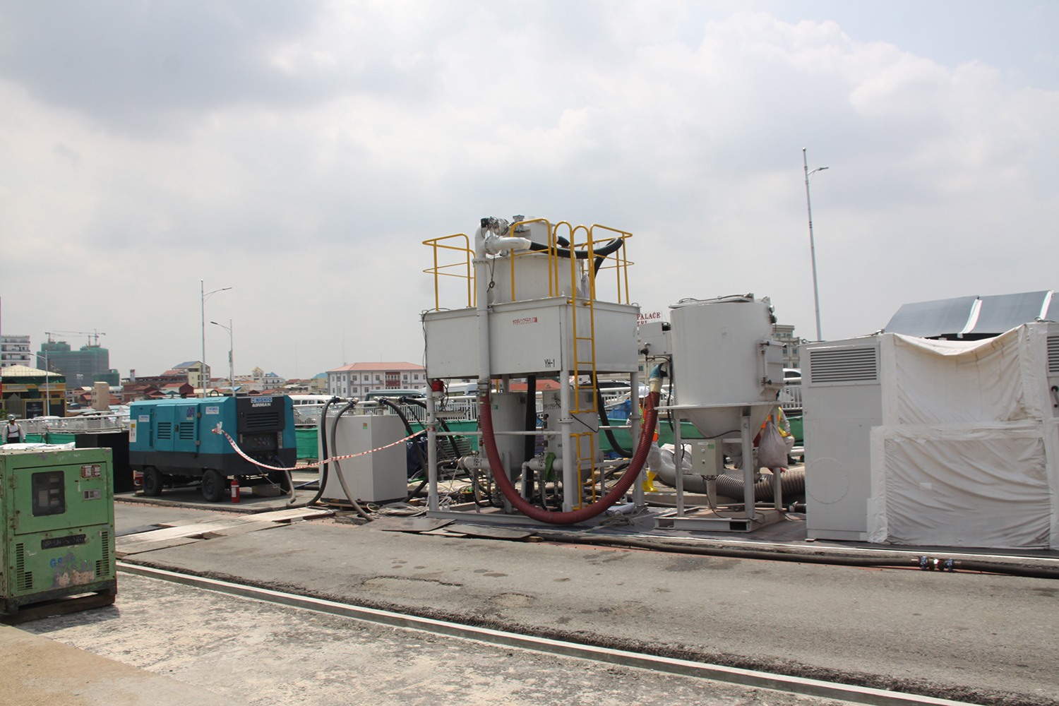 同橋は、塗装履歴から鉛が入っているであろうと判断(実際に側径間部には鉛丹、中央径間部には鉛入り錆止め塗料が使われていた)し、設計を進めていった。最終的に日本のODAとして最新の技術、最大の安全性を担保するため、環境に優しく、高い塗り替え品質を担保できる技術として循環式エコクリーンブラスト工法を採用した。また、エアラインや大型集塵機など鉛に対する安全設備は全て日本同様のものを備えている。足場も工夫している。基本的にSKパネルを採用しているが、鋼桁の上にシートを引き、吹き上がりを地具で抑え、屋根状に桁を覆った。また、側面は全て板張り養生を採用している。さらに排気口には粉塵測定器を設置し、粉じんが漏れればすぐに対応できるように備えている。