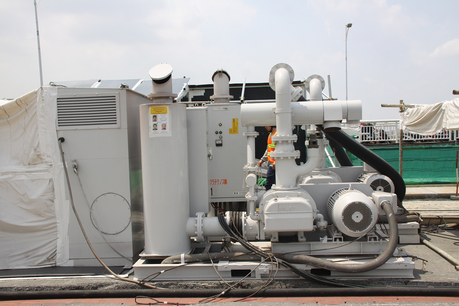 塗り替え塗装は橋本体だけでなく、支承や付属の水道管や損傷が著しい箱桁内面までを施工することになったため、塗り替え面積は最終的に20,000㎡弱まで至った。箱桁は幅が6~7m程度で、桁高は中央径間が2.5~4mの変断面、側径間が4mとなっている。ルーツブロワー(55kw)などの設備は足場内ではなく桁上に置いている。機械から足場までの揚程は10mあり、これがエアーブラストの圧送距離を制約している。今回設備類は2径間の中央部においており、左右65mの距離までブラストを打てるように設計している。