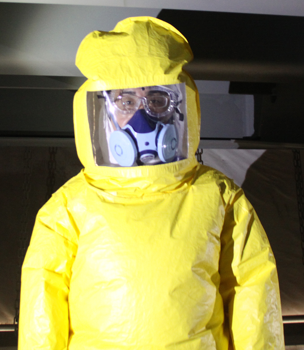 作業上の最大のネックは現場内の暑さだ。桁内部の温度計は40度を振り切っている。取材当時は乾季であり湿度は30%程度のためまだ凌げるが、雨季などにおいては、温度はそのままに湿度は80%以上に達するという。その時に役に立つのがエコクリーンスーツ(左写真)。内部に冷却装置を組み込むことで、体感温度を15~20度下げることができる。記者も着用して動いてみたが、着用前の高温が嘘のように快適に動くことができる。現場では必要な時に同スーツを着用して作業しており、業務を効率化している。