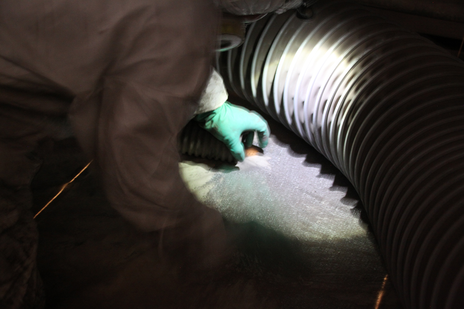今回、研削材はスチールグリットを持ってこようと考えたが、床版継ぎ目からの水漏れが尋常でなかったため、東洋製鋼製のSUS系のエコクリーンショット(カットワイヤータイプ、φ0.8mm、SUS430、300ビッカース)を持ってきた。水に濡れても錆びずに乾かすことができるというメリットがあり、単価が高いデメリットより、工事の停滞を防ぐことができるというメリットの方が高いという判断で採用している。