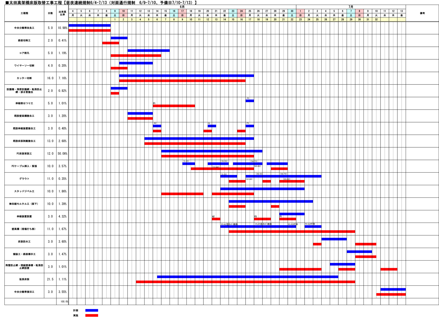 実際の1日の作業工程は、10時半頃から18時頃にかけて250tオールテーレンクレーンを使って既設床版を撤去し、18時頃から翌朝7時頃まで新設床版取り付け前の準備工を行う。夜間にバリ取りなどの施工が出来たのは、周囲が田畑で占められ、民家がほとんどないため。そして翌朝7時頃~10時半頃まで新設床版の架設というサイクルを繰り返した。