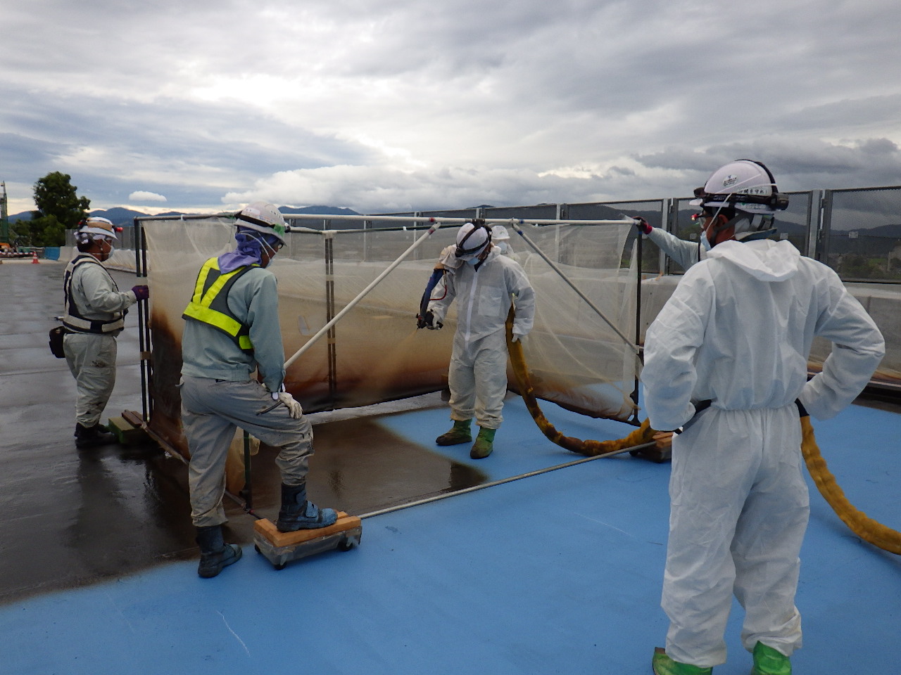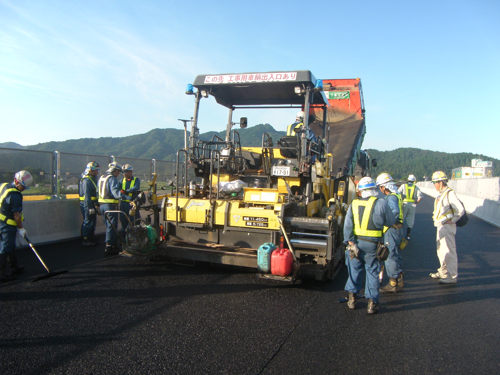 床版の架設が終了した後は、PCの縦締めを行い、高性能床版防水工(GⅡ、HQハイブレンAU工法)を吹付け施工した。施工面積は約1,700㎡。その後基層、舗装を敷設し、7月10日に対面通行規制を解除後、7月13日に交通開放した。
