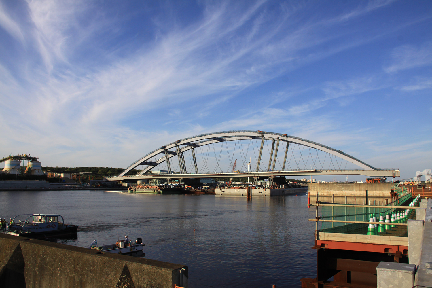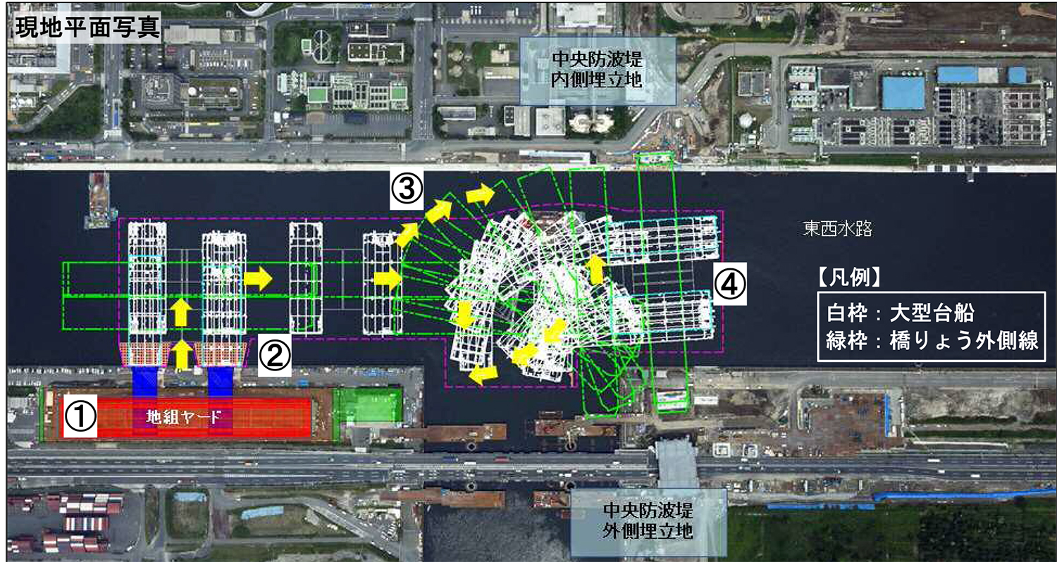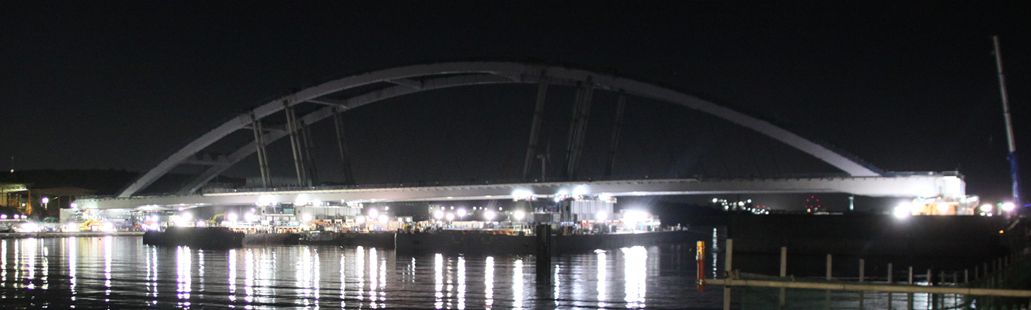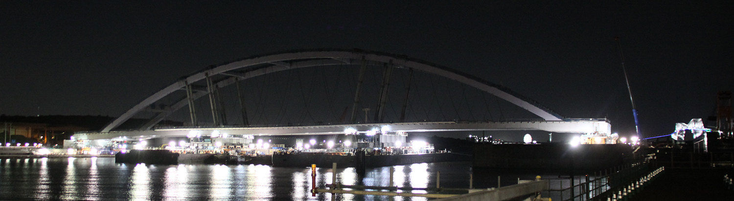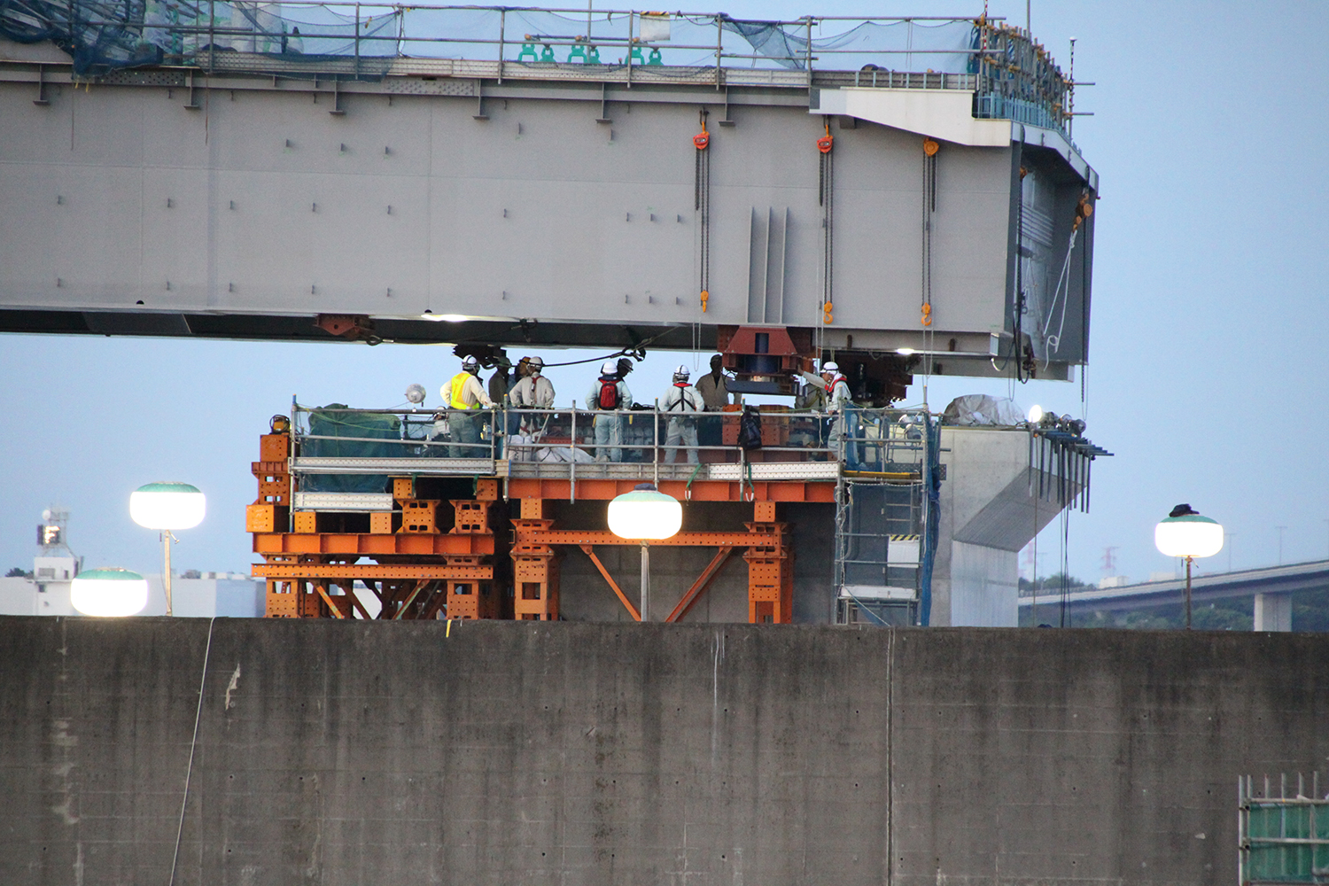 上部工の製作・架設はIHI・JFE・横河・三井JV、一次下請は多軸台車が山九、台船が深田サルベージ建設、ジャッキ操作がオックスジャッキ、架設がトキワエンジニアリング、現場溶接が島川工業。溶接検査が日本X線検査。(2018年10月31日掲載、井手迫瑞樹)