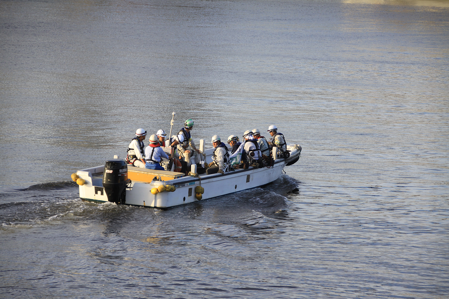 10分間でさらに橋軸方向へ8.5m動いた/架設工が現場へ船で乗り込む(両写真とも井手迫瑞樹撮影)