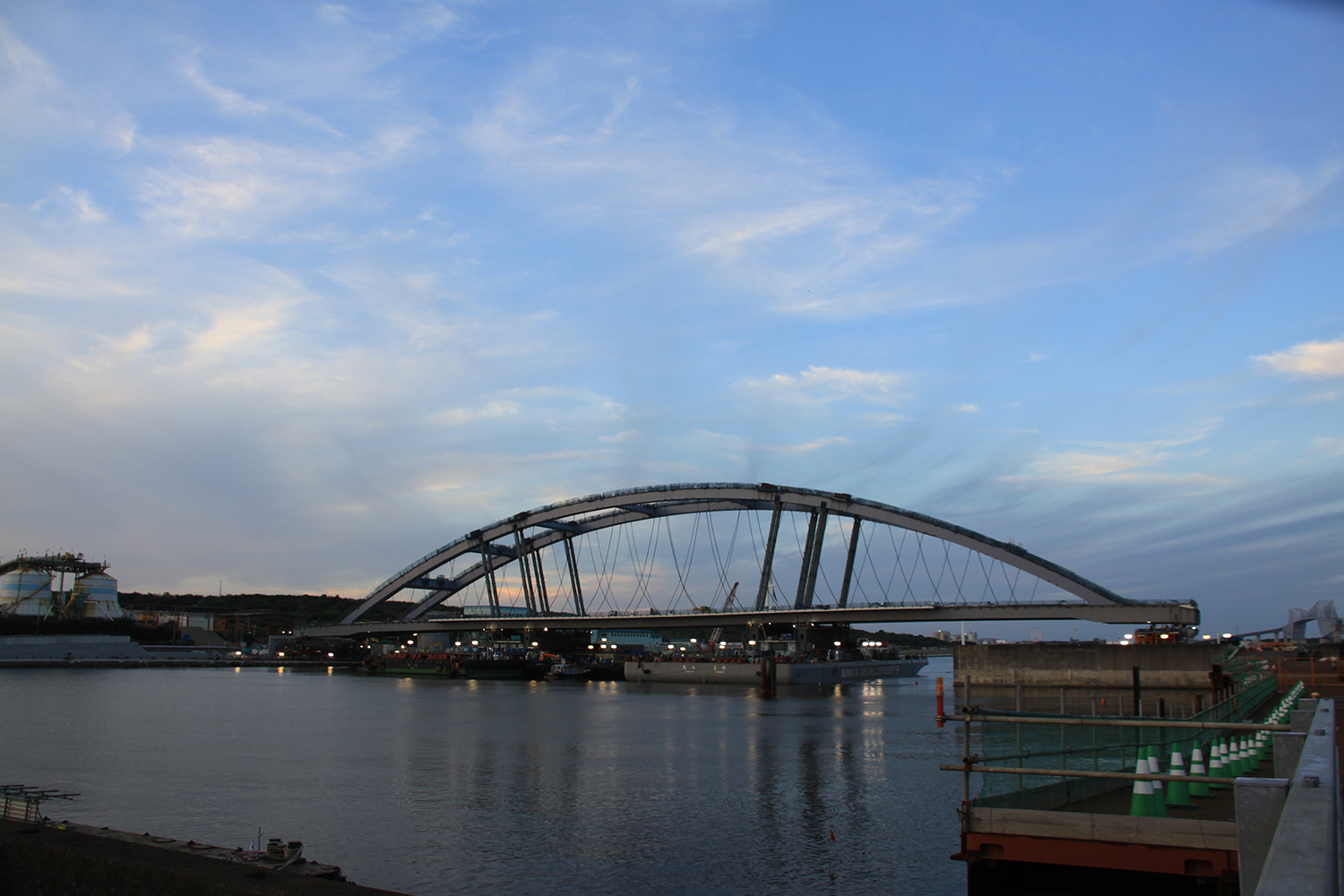 仕切り直して18日は、風もべた凪であり、午前中に桁を86度回転させて実際に架ける橋軸と同じ角度にした。さらに53mほど架設地点まで接近し、潮待ちして17時42分から10分間かけてさらに橋軸方向に8.5m動いた。その後18時15分まで潮位がA.P+1.4mを超えるまで待った。これは「潮位が上がることによって船を上げ橋が橋脚上の仮受設備を超えるのを待つ必要があった」(同JV)ためだ。