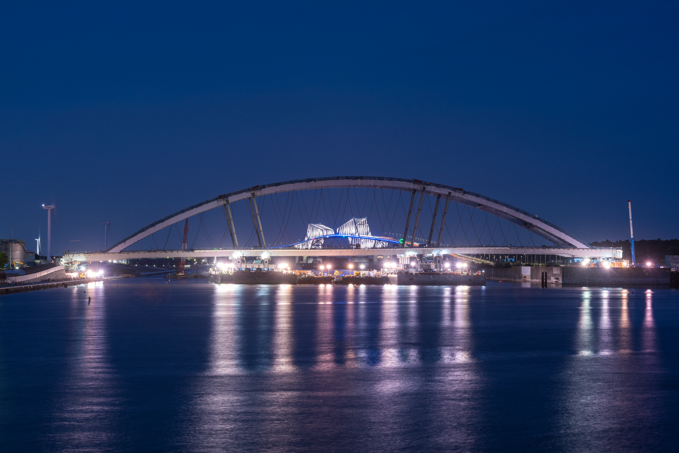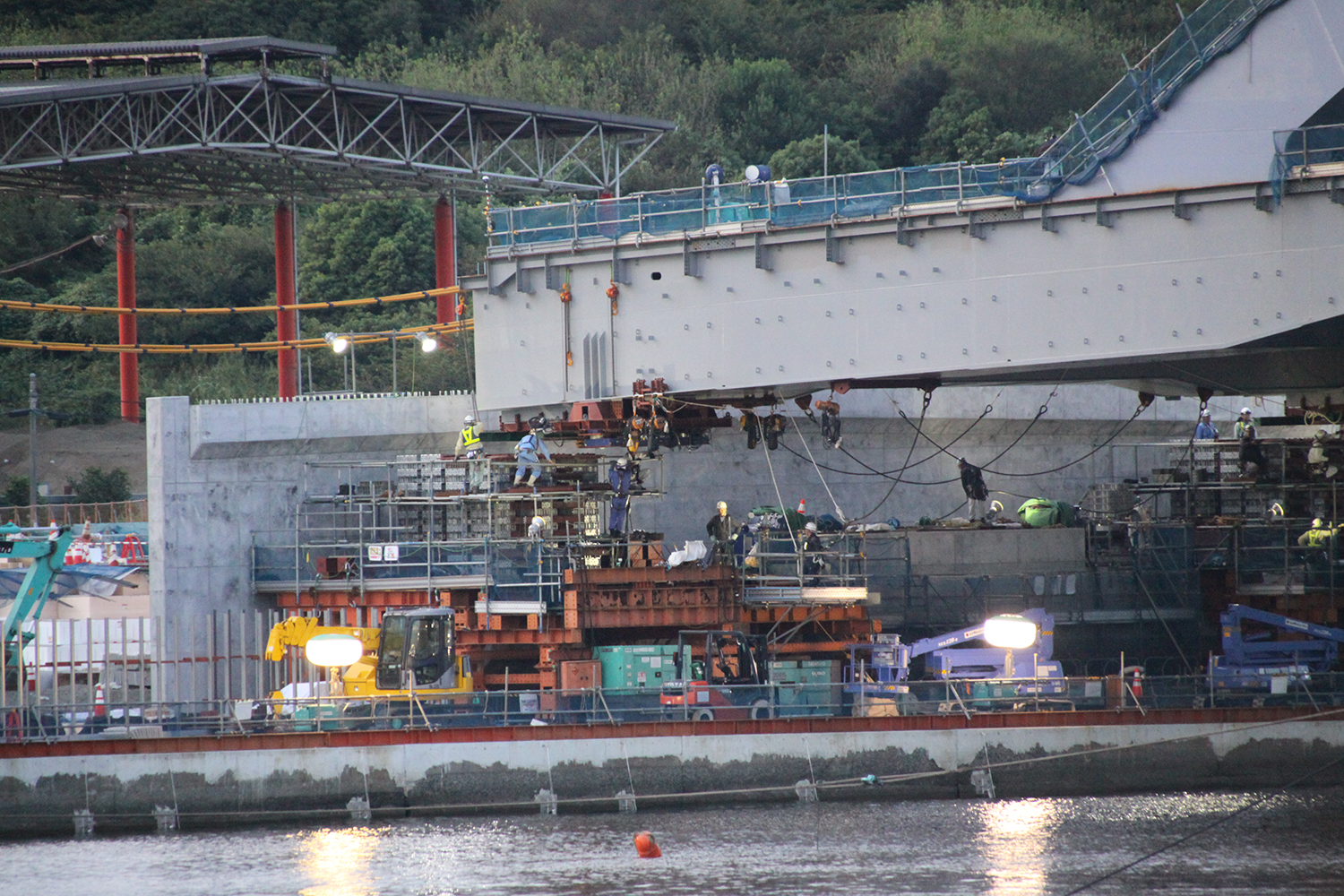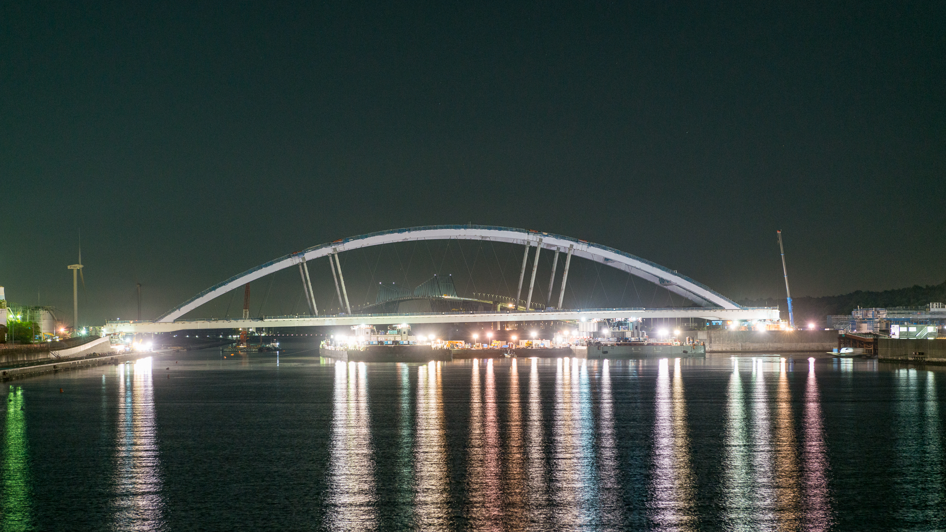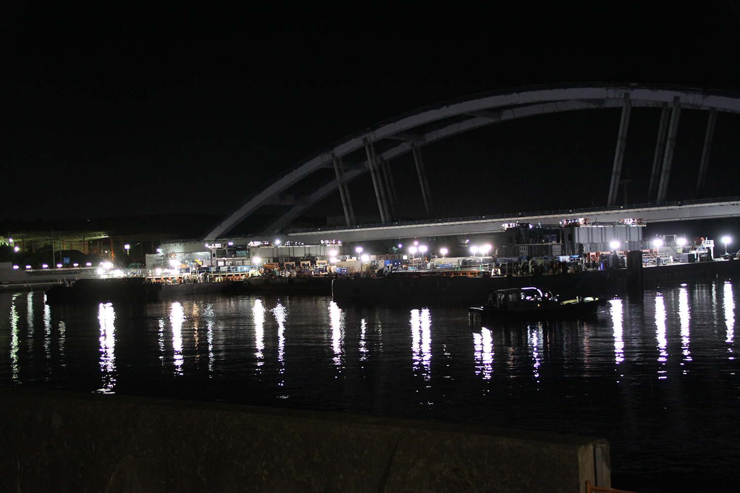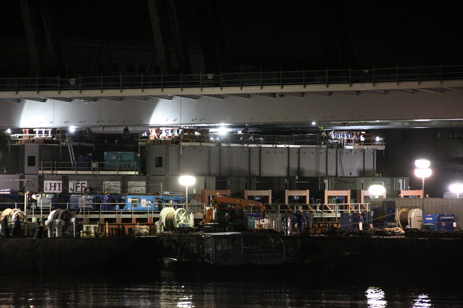 潮位が上がった後、橋軸直角方向に4mほど動いて架橋位置を合わせ、19時26分から23時47分まで4時間半ほどかけて潮位(+1.61m→+1.45m)およびバラスト(1,200mmほど沈降)を使って1.36mほど桁を降下させ、深夜0時過ぎには荷重を台船からA1およびP1に移し替え、台船を退出させた。