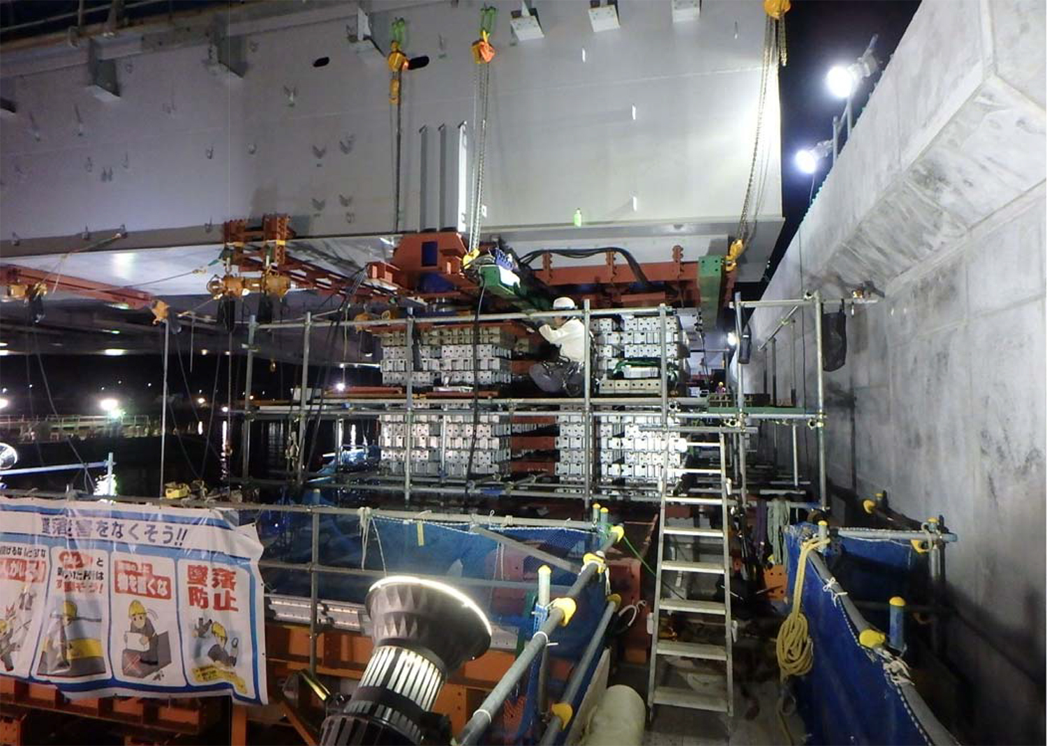 ほぼ降下を終えた桁(23時半ごろ撮影)(井手迫瑞樹撮影)