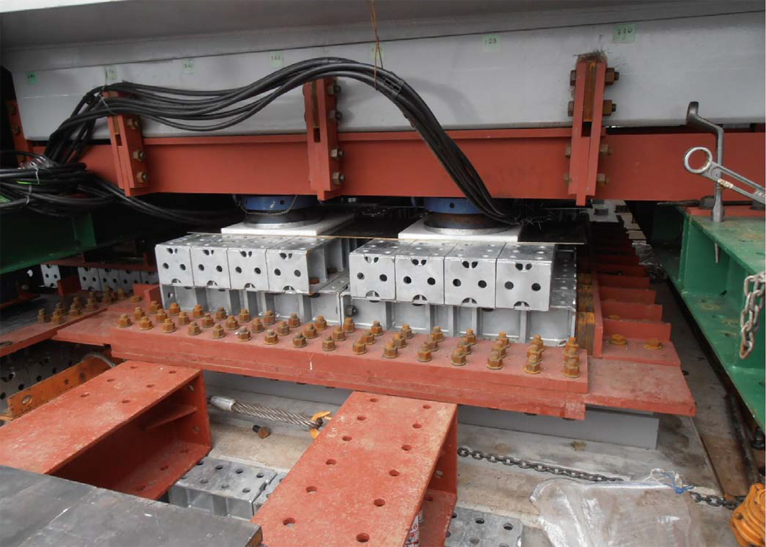 下部工に桁を受ける時の安全面の配慮としては、受け替え時に支持系が、台船支持系(中間部受点)から支点支持系(下部工上の端部受点)へ変わるため桁のたわみが変化する。端部の支点に荷重がかかってくると、約250mm水平変位するが、変位を両方に逃がすと施工性が悪くなってしまうため、P1を固定とし、A1側に水平変位に追従する設備を設置した。桁はあらかじめ降下ジャッキを逆さまに吊り、ジャッキヘッドに滑りプレート(MCナイロン板)を付け、ステンレス板の架台上を滑らせることによって対応した。ジャッキを突くことにより、桁とサンドルとの間に隙間を設け、サンドルを抜きストロークダウンするという工程を4夜間にわたって続け、所定の位置まで桁を降ろした。1回あたりのジャッキストロークは約100mm。