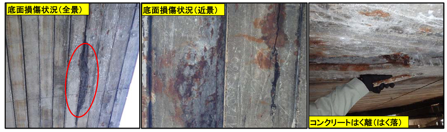 同橋は、昭和45年道路橋示方書に基づいて設計され、昭和49年に供用された。今回施工する現場のPCI桁は、主桁が34本もあり、横締めPCの平均スパンが1,000mmと比較的長く、かつその位置がちょうど桁高中間に位置しているため、「供用後長期間経過し、間詰コンクリートとPC桁の付着性が必ずしも保たれていない可能性があった」(元請のオリエンタル白石・日本ピーエスJV)。加えて床版防水は平成24年に初めて設置していた。また、間詰コンクリート部とPC桁との界面から伝った凍結防止剤を含んだ水が桁下に波及し、エフロの発生や剥落、劣化が著しい箇所ではPC鋼材の腐食切断を引き起こしていた。同橋は外側に2%の横断勾配を有しているが、やはり勾配の低い水下側ほど劣化が拡大している傾向にあった。これは以前取材した菅野川橋と同様の傾向である。このため、西日本高速道路の大規模更新事業としては初となる桁の全面的な取替を選択することとした。