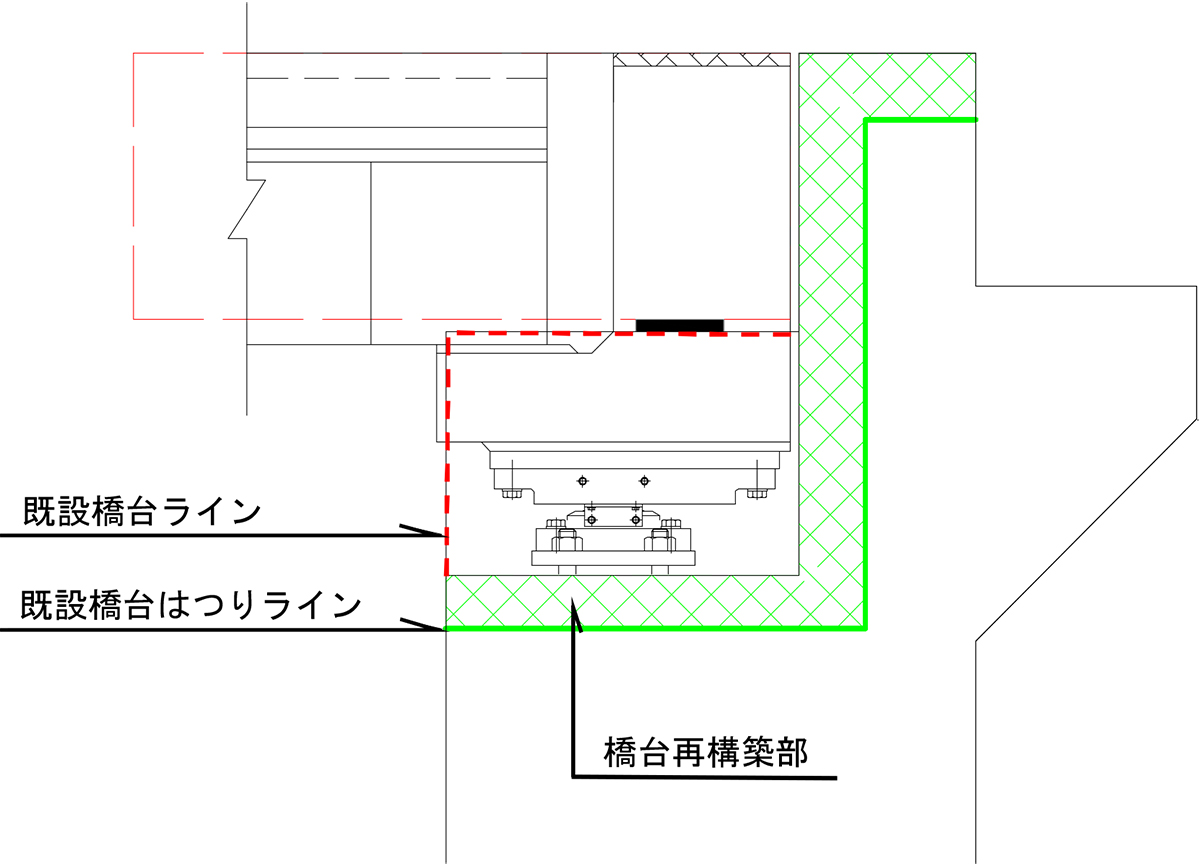 この後が、通常の桁取替にはない工程である。SCBR工法は、支点上にパラペット形状の横桁を入れる構造であるため、「新設のPCT桁の桁高は既存のPCI桁と変わらないが、横梁と新設支承高分の高さ(約500mm)を新たに必要とする」(同)。そのため、既設橋脚を約600mm分はつり込んで鉄筋を出し、約100mm分新たに打設した。はつりは大半の500mm程度を連孔コア及びワイヤーソーで撤去し、最後の約100mmは機械式のWJを用いて丁寧にはつった。人家連坦地であるため、WJによる騒音を考慮し、平日は8時~17時、土日は9時~17時に時間を限定して施工した。