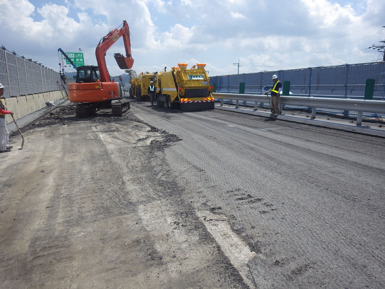 施工(桁の撤去~再架設)は、夏期交通混雑期明けの9月3日から11月5日までの予定だ。桁下が国道であるため、既設桁切断撤去時の不測の落下に備え、事前にH鋼材で桁下防護を設置した。撤去はまず桁上の舗装を剥ぎ、高欄を平均3mスパンでワイヤーソーを用いて吊切断する。具体的には、まず3mスパンで縦に切断し、25tクレーンで吊った状況で地覆から横に切る。次いで、34本ある桁を2本ずつ17ブロックに分けてコアカッター(支点部)およびロードカッター(通常部)で切断し、120tクレーンで撤去するが、切断後の撤去作業は2日間で施工を終えた。