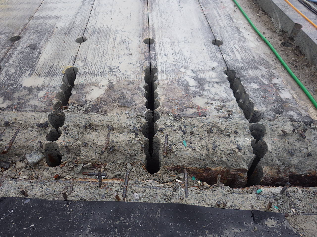 同橋は、昭和45年道路橋示方書に基づいて設計され、昭和49年に供用された。今回施工する現場のPCI桁は、主桁が34本もあり、横締めPCの平均スパンが1,000mmと比較的長く、かつその位置がちょうど桁高中間に位置しているため、「供用後長期間経過し、間詰コンクリートとPC桁の付着性が必ずしも保たれていない可能性があった」(元請のオリエンタル白石・日本ピーエスJV)。加えて床版防水は平成24年に初めて設置していた。また、間詰コンクリート部とPC桁との界面から伝った凍結防止剤を含んだ水が桁下に波及し、エフロの発生や剥落、劣化が著しい箇所ではPC鋼材の腐食切断を引き起こしていた。同橋は外側に2%の横断勾配を有しているが、やはり勾配の低い水下側ほど劣化が拡大している傾向にあった。これは以前取材した菅野川橋と同様の傾向である。このため、西日本高速道路の大規模更新事業としては初となる桁の全面的な取替を選択することとした。