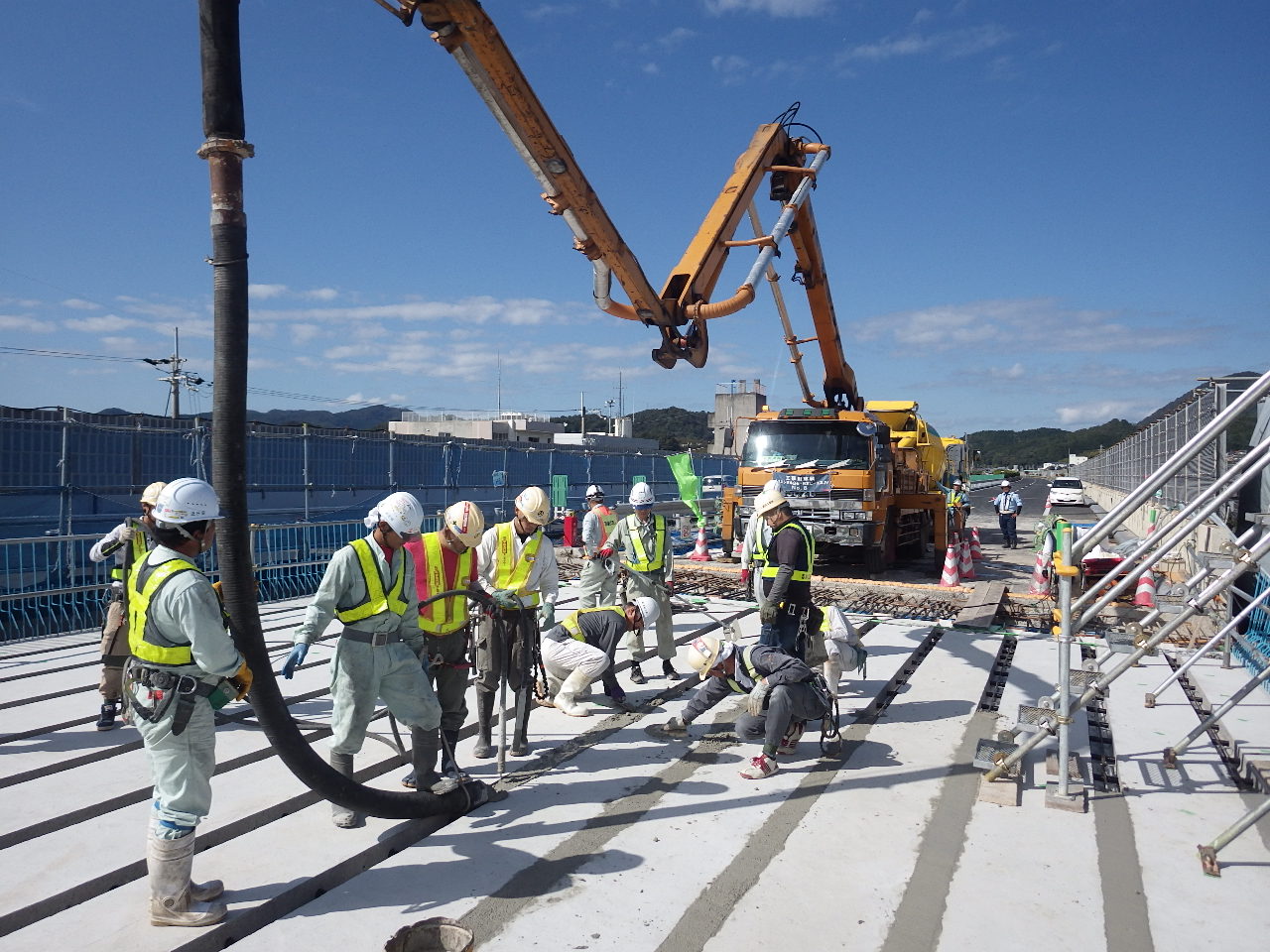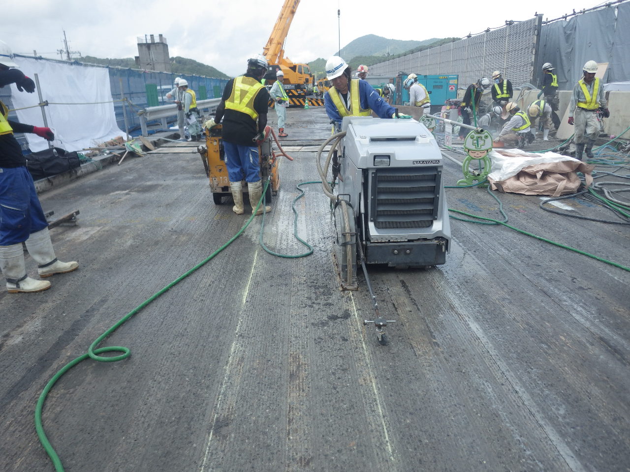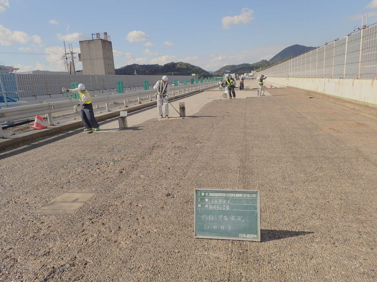 架設した桁は、横組コンクリートで横梁と一体化し、沓座モルタルの打設と、横締めおよびグラウトを施工した。横梁の仮受けを撤去して、既設中空床版橋と鉄筋および特殊モルタルで連結し、ジョイントを無くしたシームレス構造にすることで漏水による支承や桁の損傷を未然に防いでいる。その後、壁高欄(現場打ち)を打設、高性能床版防水を施工した上で舗装を敷設し、工事を完了した。なお床版防水はダイフレックスの「レジテクトGS-M工法」を採用している。同工法を採用した理由は、珪砂を撒いて清掃する必要がないためだ。