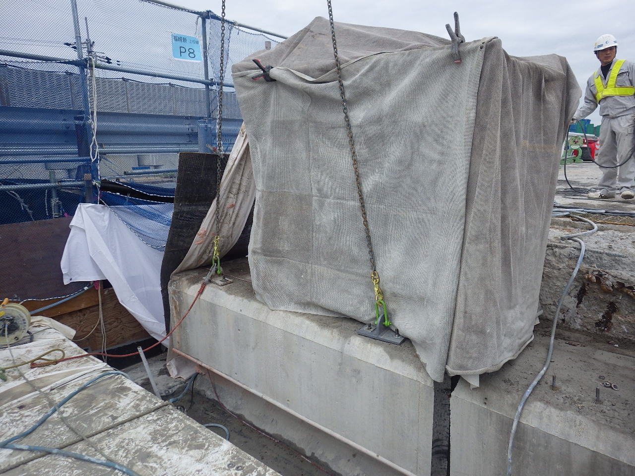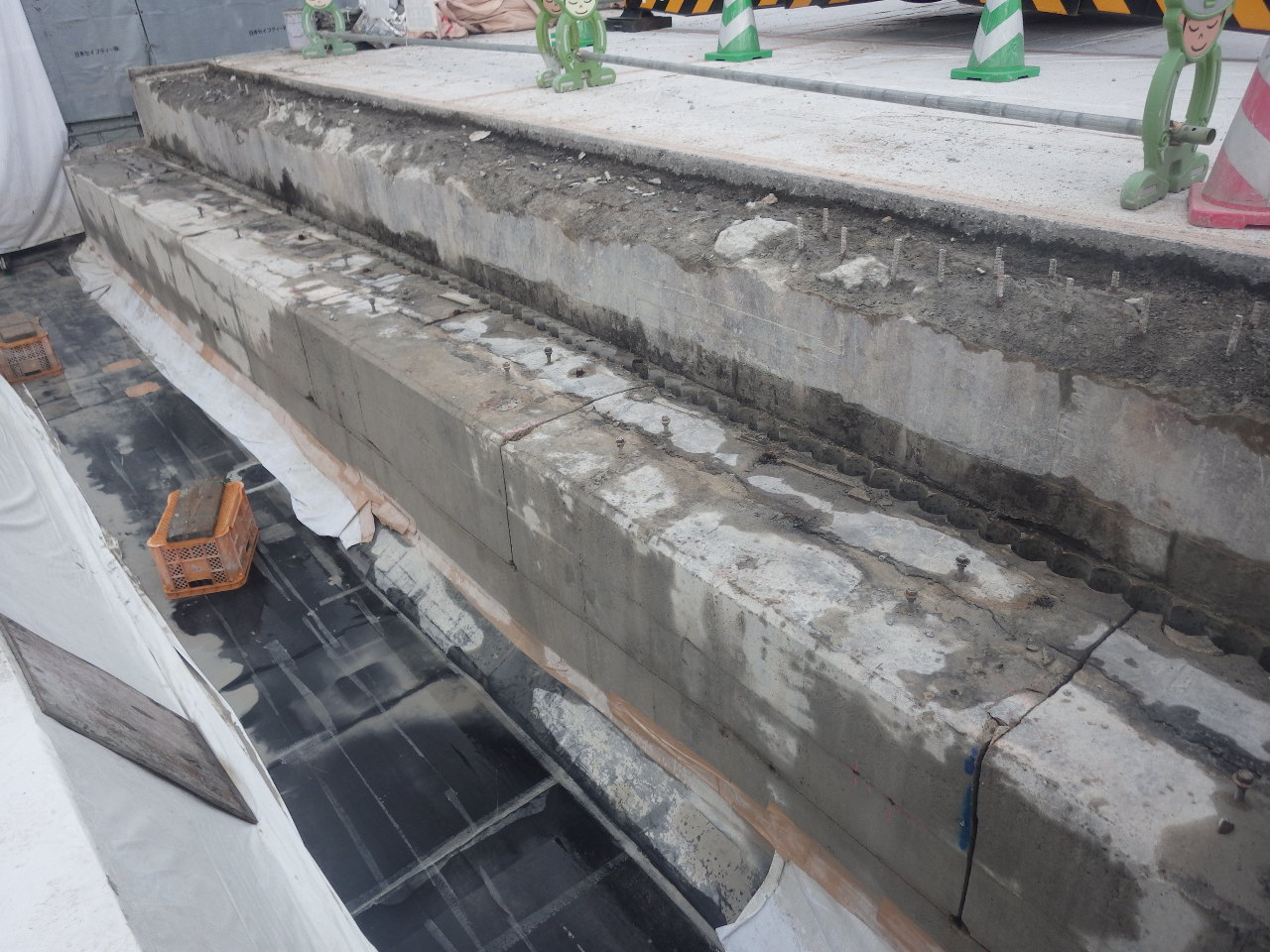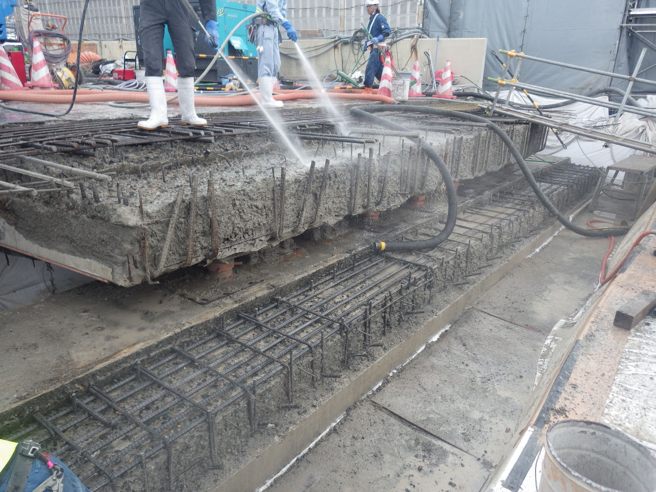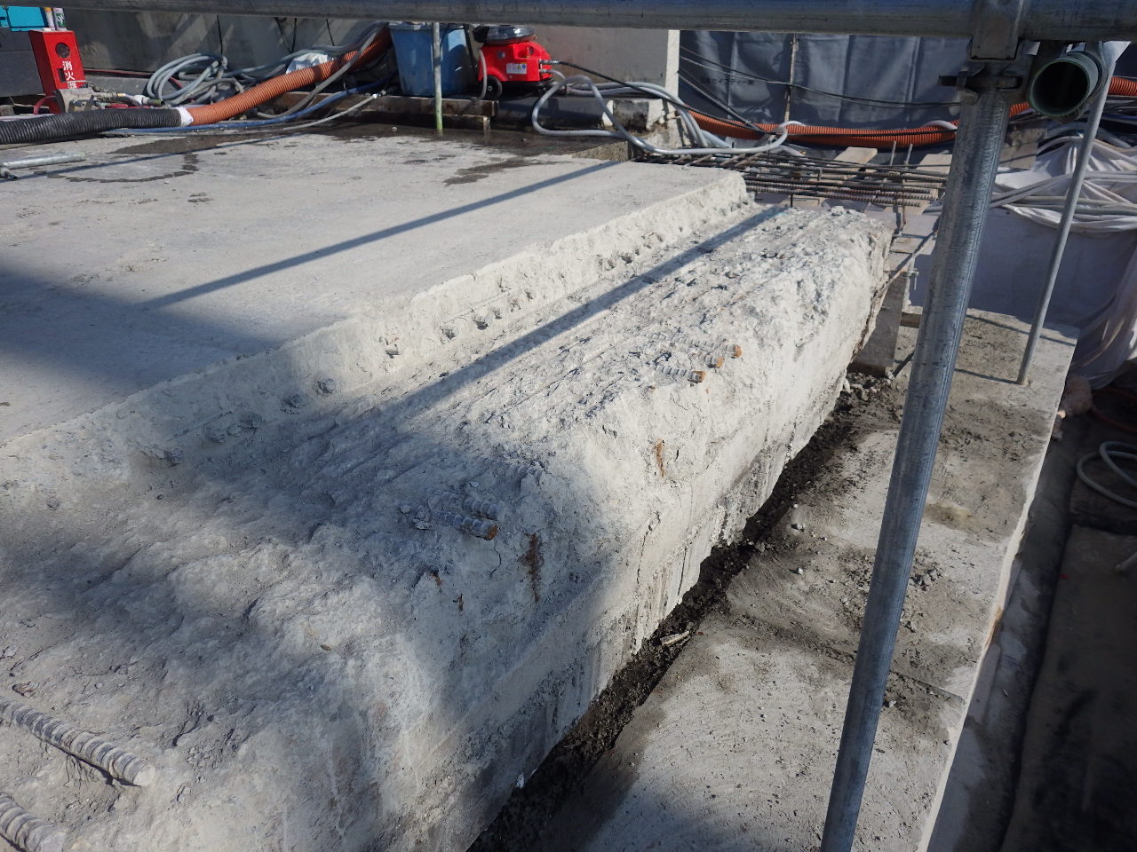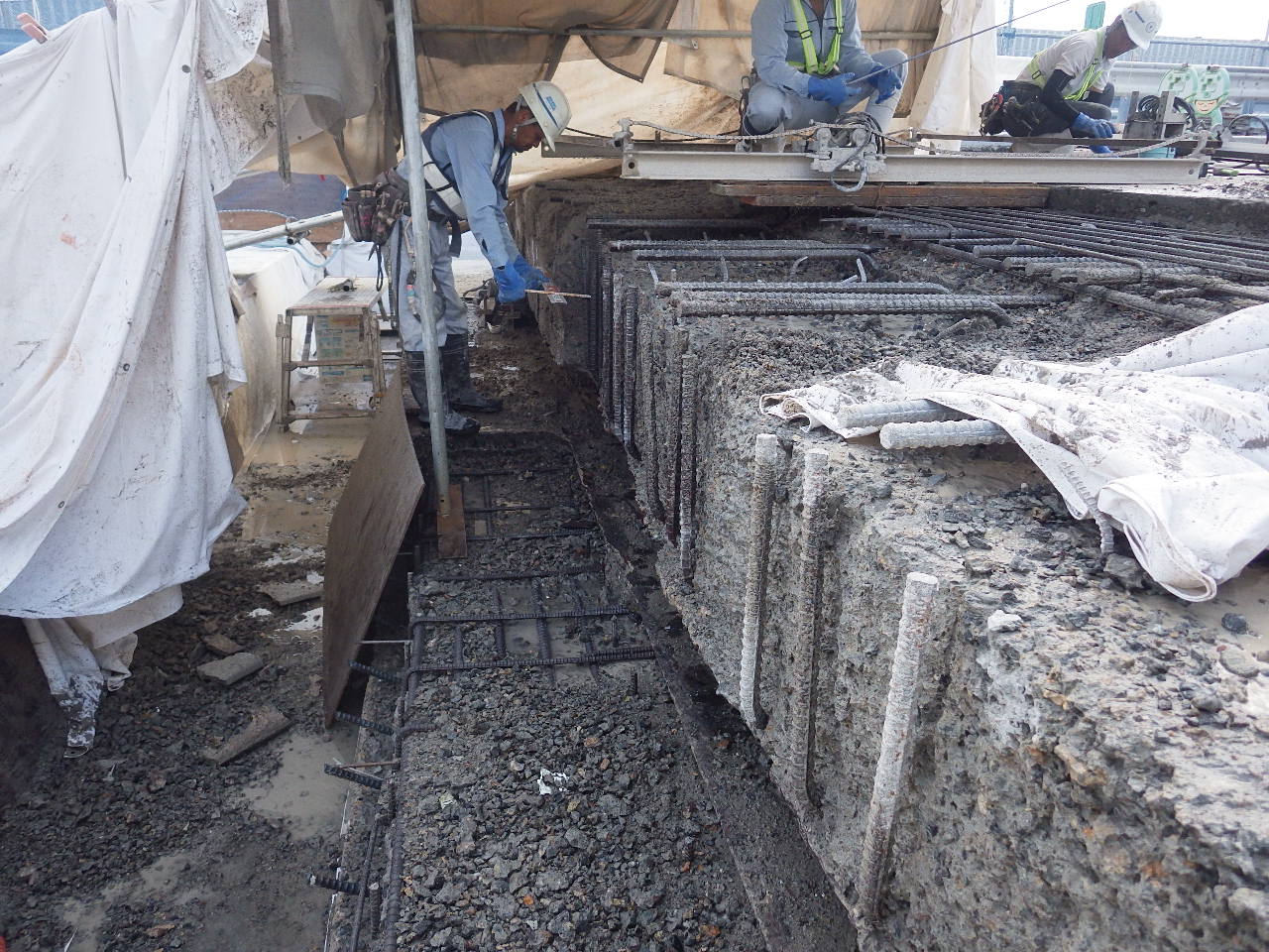 この後が、通常の桁取替にはない工程である。SCBR工法は、支点上にパラペット形状の横桁を入れる構造であるため、「新設のPCT桁の桁高は既存のPCI桁と変わらないが、横梁と新設支承高分の高さ(約500mm)を新たに必要とする」(同)。そのため、既設橋脚を約600mm分はつり込んで鉄筋を出し、約100mm分新たに打設した。はつりは大半の500mm程度を連孔コア及びワイヤーソーで撤去し、最後の約100mmは機械式のWJを用いて丁寧にはつった。人家連坦地であるため、WJによる騒音を考慮し、平日は8時~17時、土日は9時~17時に時間を限定して施工した。