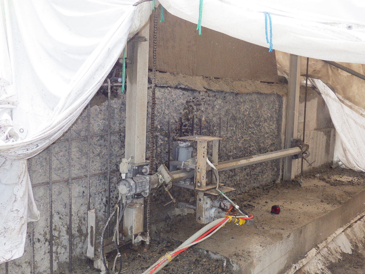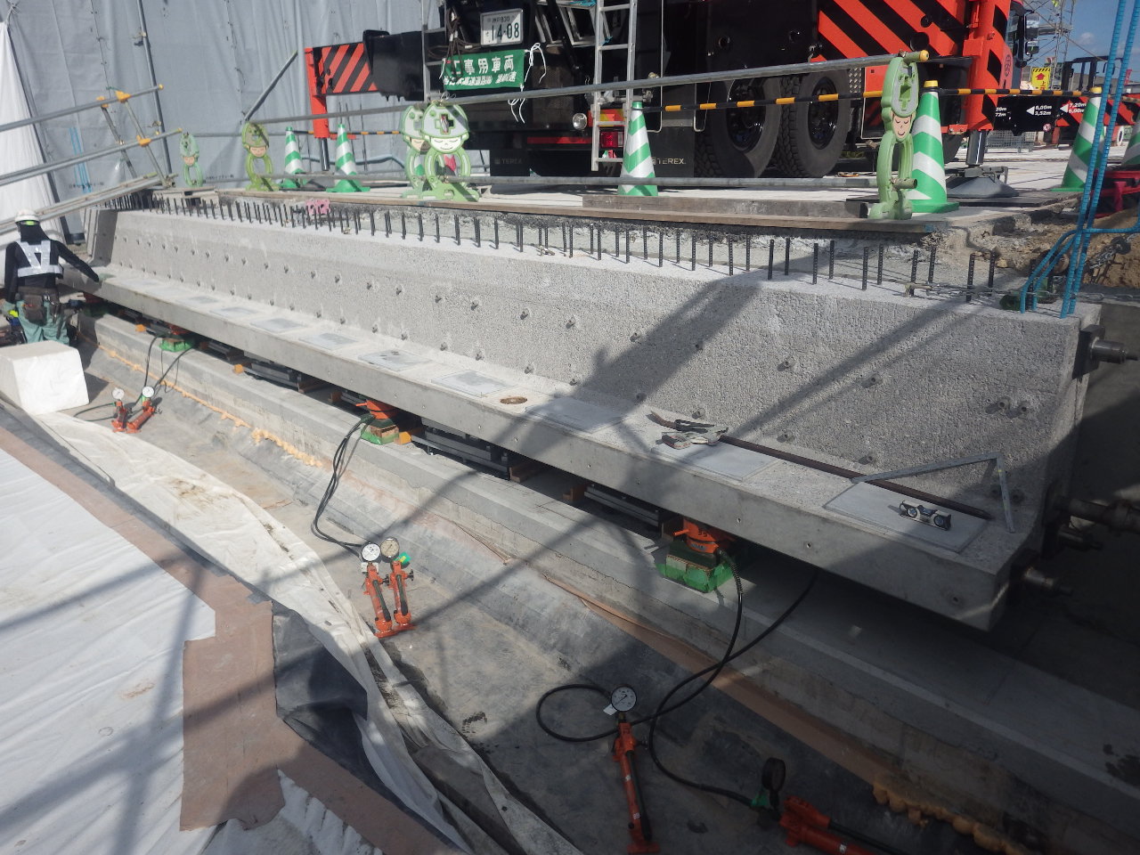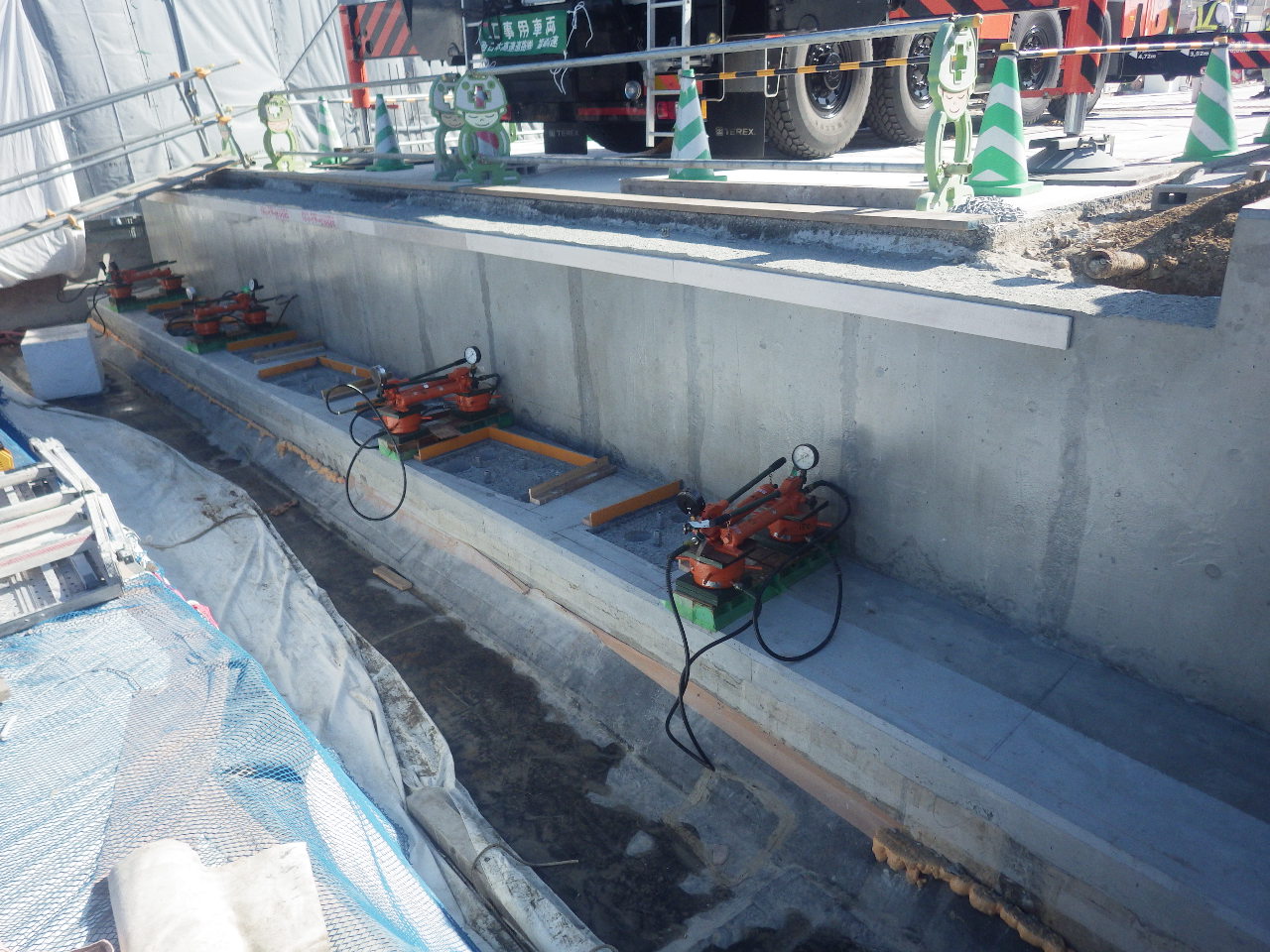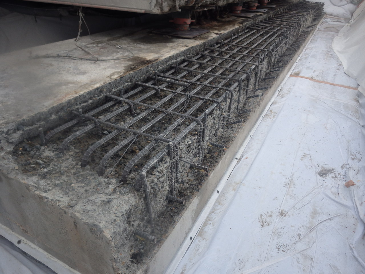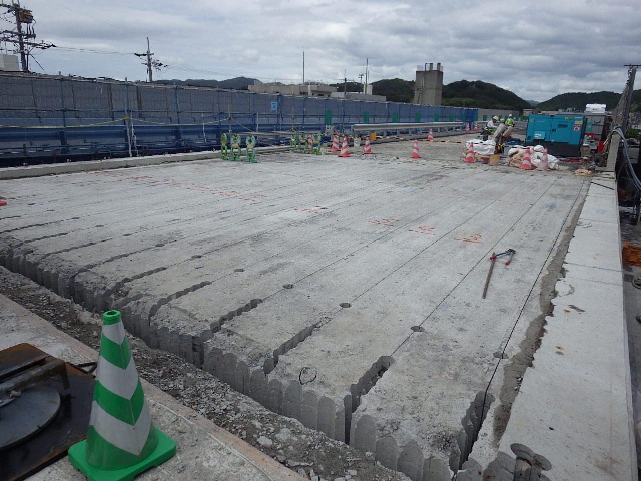 この後が、通常の桁取替にはない工程である。SCBR工法は、支点上にパラペット形状の横桁を入れる構造であるため、「新設のPCT桁の桁高は既存のPCI桁と変わらないが、横梁と新設支承高分の高さ(約500mm)を新たに必要とする」(同)。そのため、既設橋脚を約600mm分はつり込んで鉄筋を出し、約100mm分新たに打設した。はつりは大半の500mm程度を連孔コア及びワイヤーソーで撤去し、最後の約100mmは機械式のWJを用いて丁寧にはつった。人家連坦地であるため、WJによる騒音を考慮し、平日は8時~17時、土日は9時~17時に時間を限定して施工した。