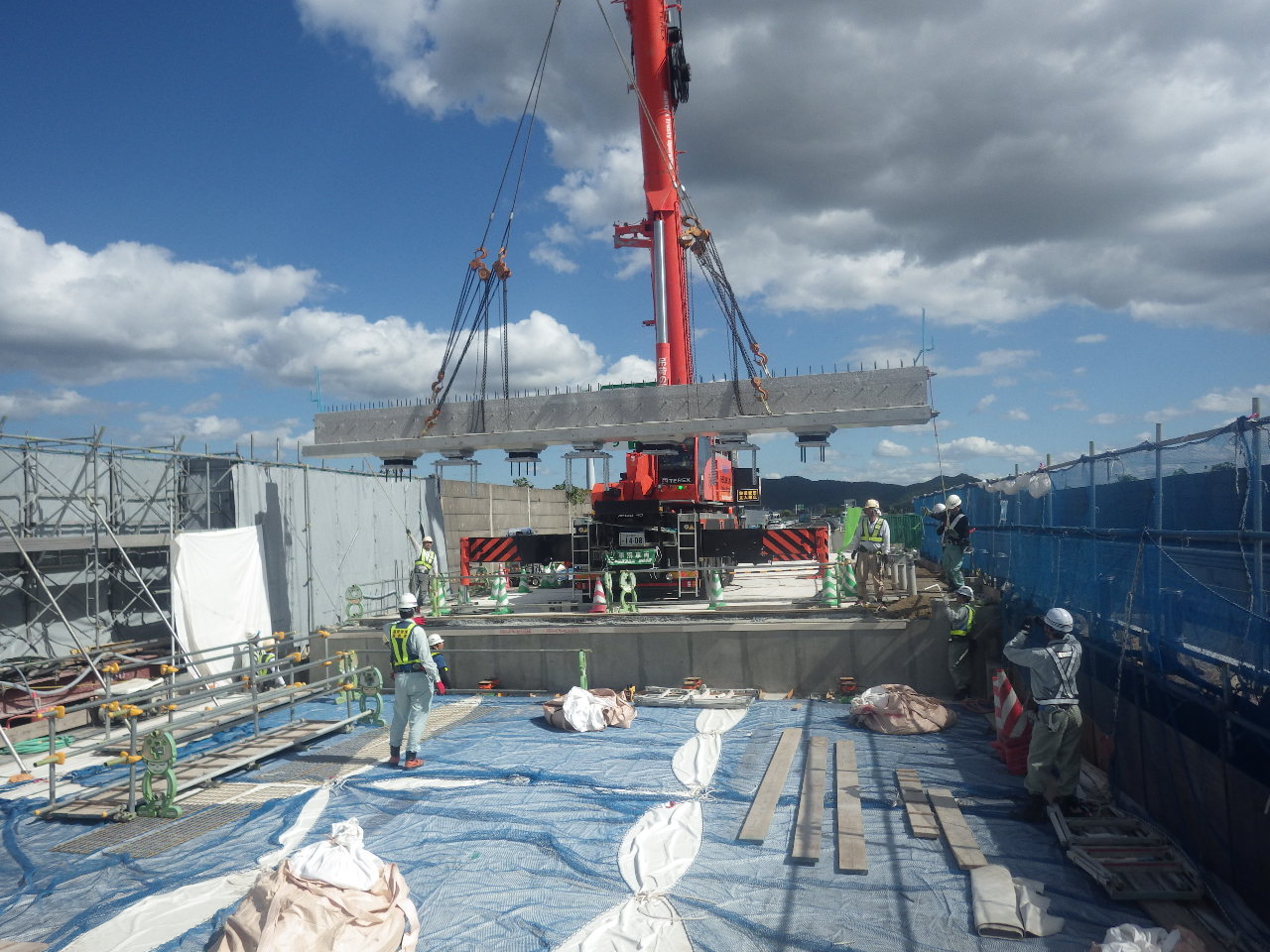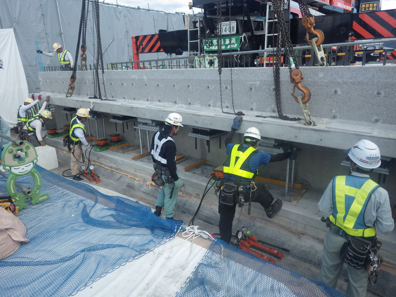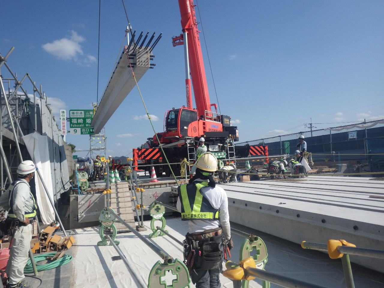桁架設はまず梁の下側に支承を付けた横梁(10.5tおよび14t)を120tクレーン(桁架設も同機種を使用)で両橋脚に設置、仮受けし、その後、14本のPCT桁(1本当たり8t)を真ん中から順次架設していく。桁の架設(・撤去も同様)に際しては、直下の交通や家屋に配慮して、桁吊時の旋回半径を既設桁内に収まるよう配慮するとともに、一時的に直下の交通を止めて施工した。