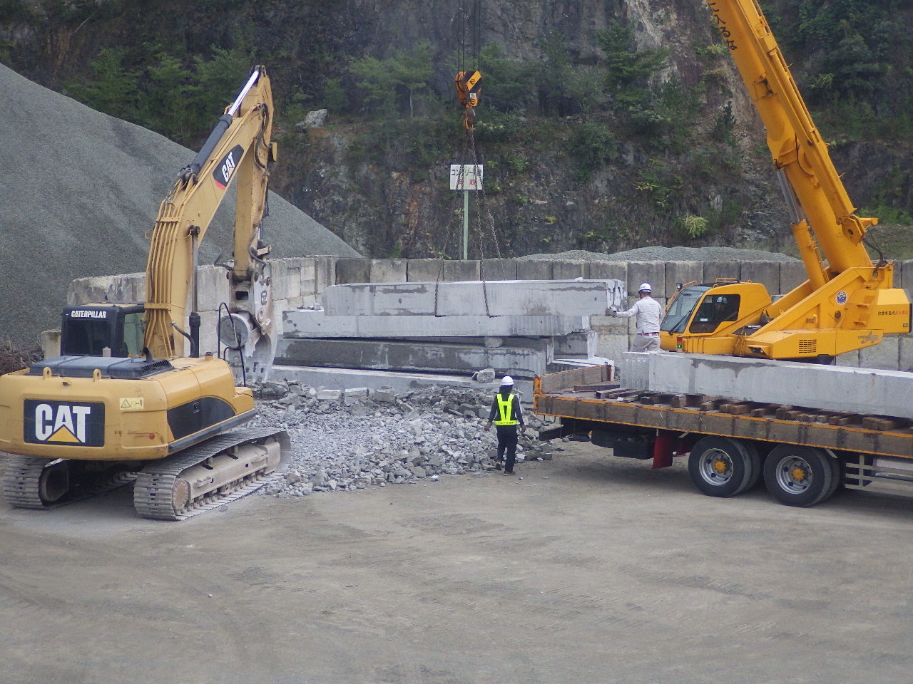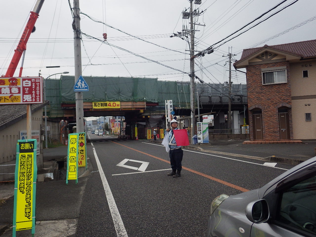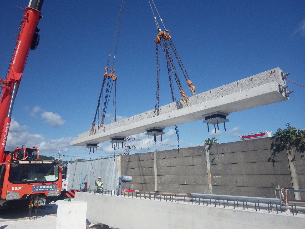 桁架設はまず梁の下側に支承を付けた横梁(10.5tおよび14t)を120tクレーン(桁架設も同機種を使用)で両橋脚に設置、仮受けし、その後、14本のPCT桁(1本当たり8t)を真ん中から順次架設していく。桁の架設(・撤去も同様)に際しては、直下の交通や家屋に配慮して、桁吊時の旋回半径を既設桁内に収まるよう配慮するとともに、一時的に直下の交通を止めて施工した。