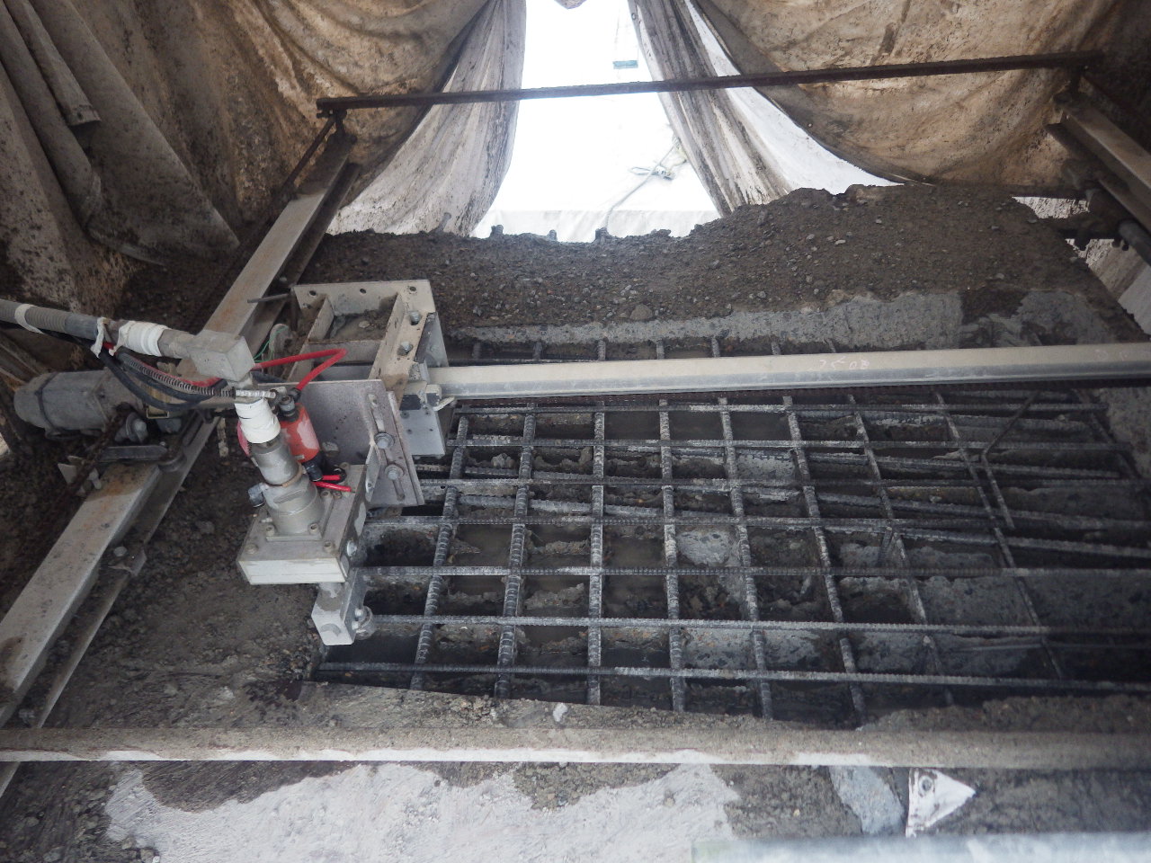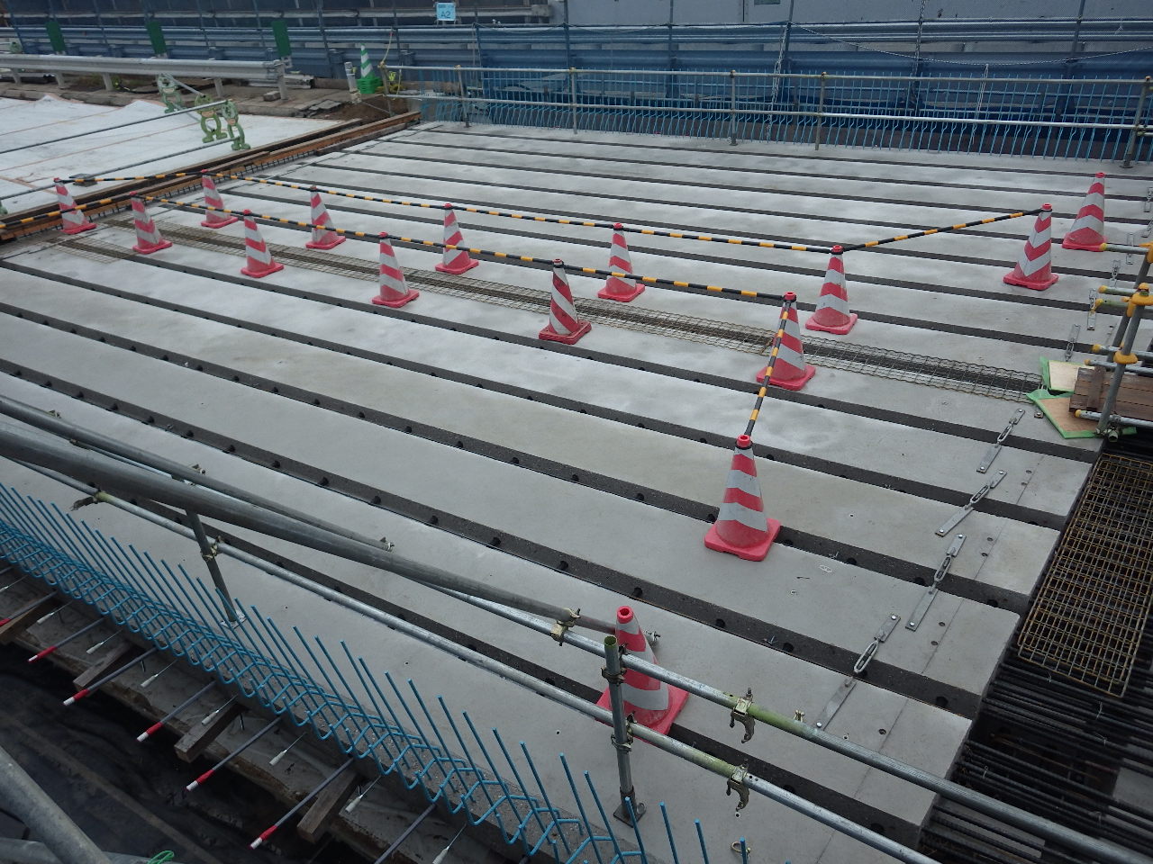 主桁間の間詰に際しては、桁下防護からPCT桁下端のクリアランスは200mmしかない。これは桁下の国道制限高を確保するため、それに対応した防護高さにしたためだ。