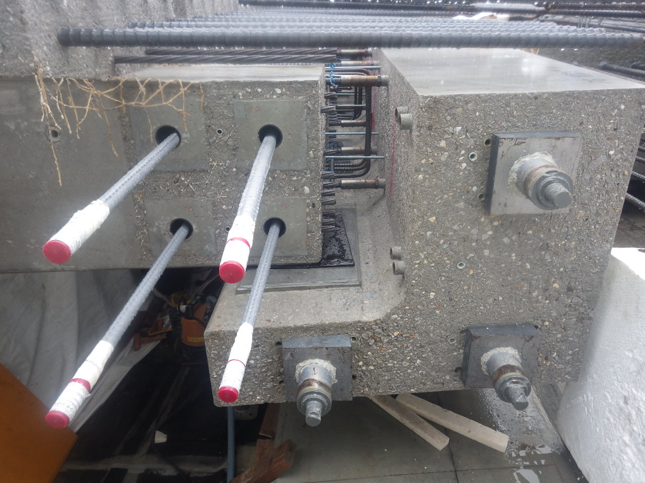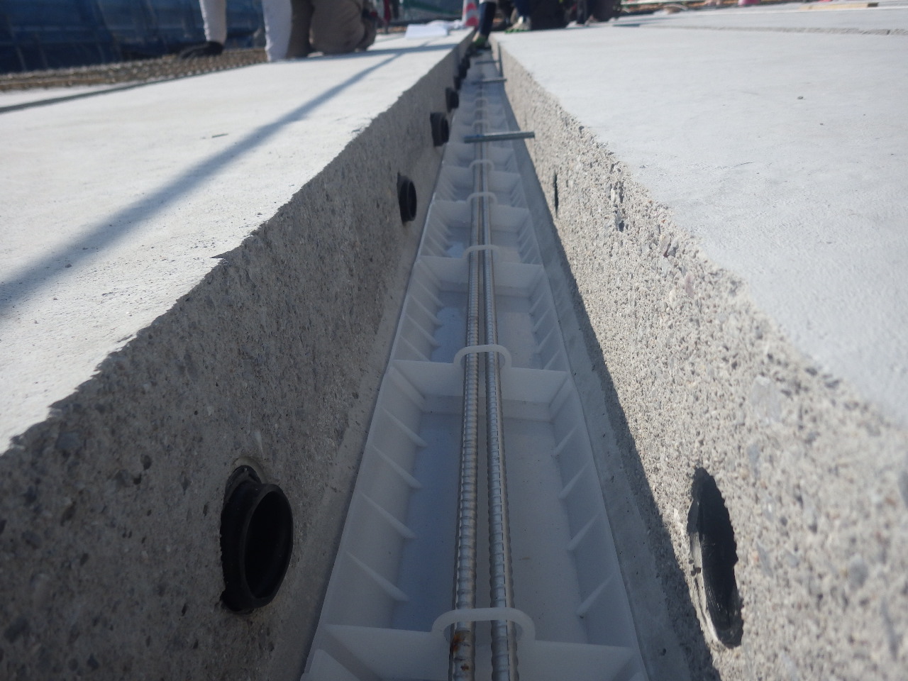 そのため間詰部の下端には高密度ポリエチレン製の埋設型枠を設置し、また中間横桁を要しない上部構造として桁下での作業を不要とした。埋設型枠本体には鉄筋を貫通させ架設後の剥落も抑止する構造とした。貫通鉄筋はステンレス鉄筋を採用、ひび割れによる水が入っても簡単には腐食しないようにしている。