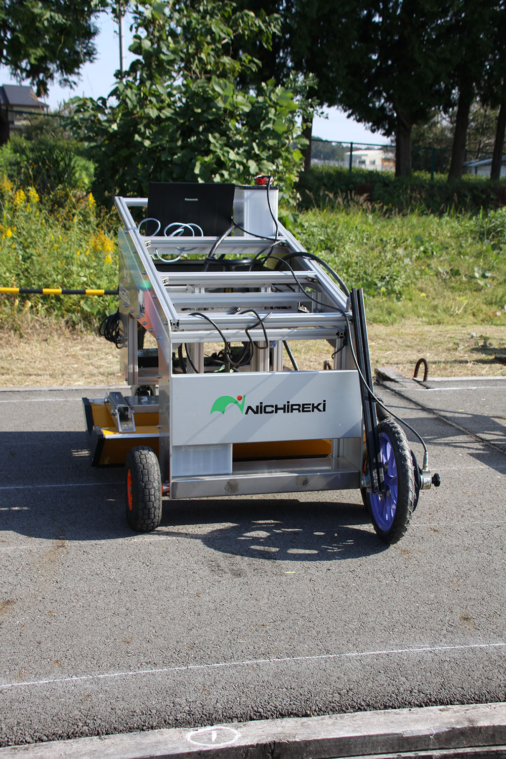 ニチレキ「床版キャッチャー」 マルチステップ周波数方式の電磁波レーダーを使って床版の損傷を舗装上面から測定する装置。開発は5~6年前に開始した。車載タイプ(同180cmが4台、同240cmが1台)を5台保有し、そのうちの1台に手押しタイプ(アンテナ幅90cm)を搭載している。計測車の後部に搭載した電磁波レーダー(200MHZ~3GHz)は、1回の測定で3次元のデータを同時に取得可能であり、左右へスライドする機能により、交通規制なく安全に損傷の多い橋梁端部まで計測を可能としている。