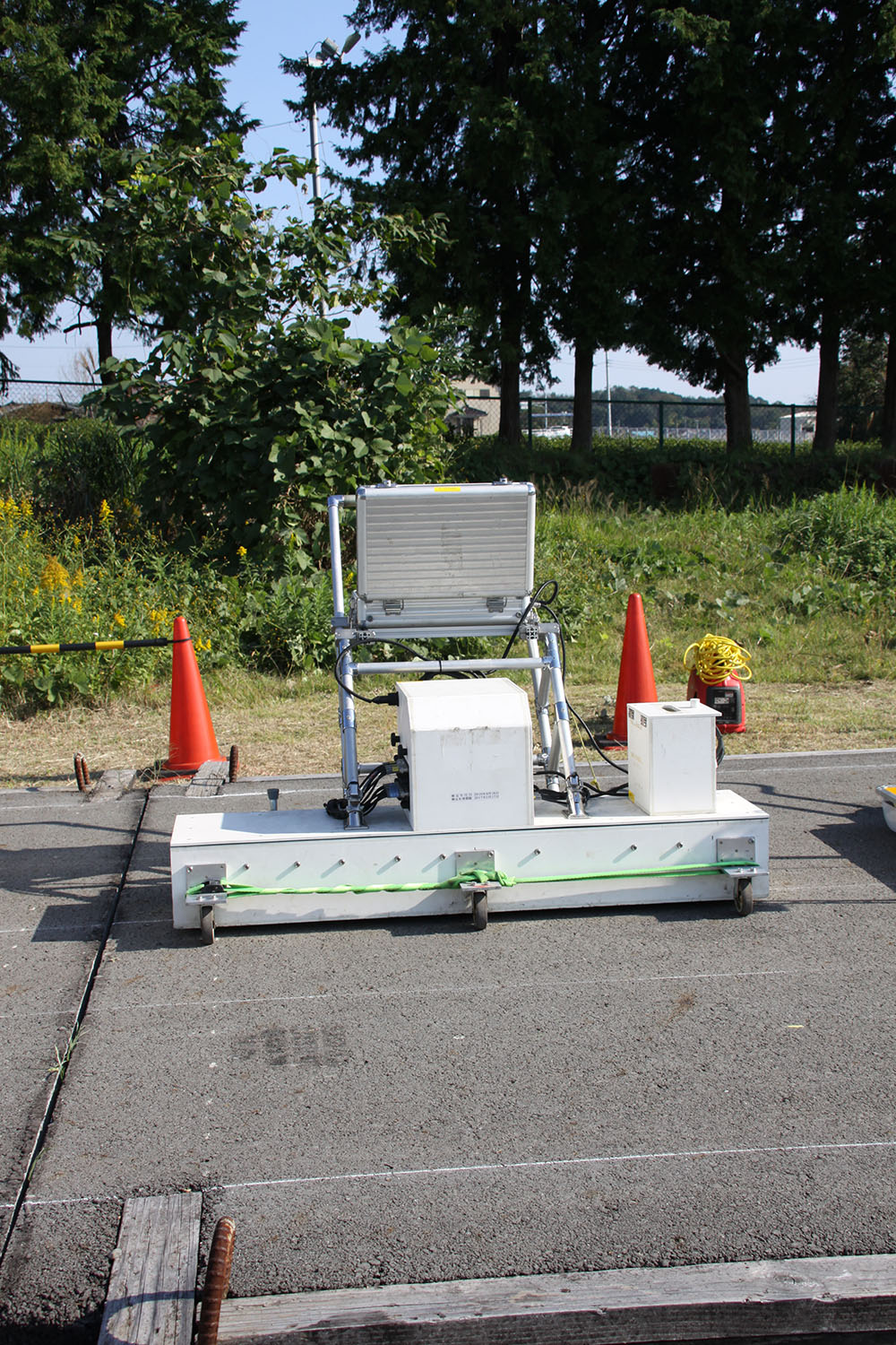 全国の床版上面の損傷を分類整理して、実物大のモデル供試体を用いた実験を行い電磁波の波形をパターン化することで、独自の評価基準を作成し安定した精度で解析することを可能としている。また、PCのリモート操作により解析状況を現場で確認できる仕組みを構築し実績を有している。