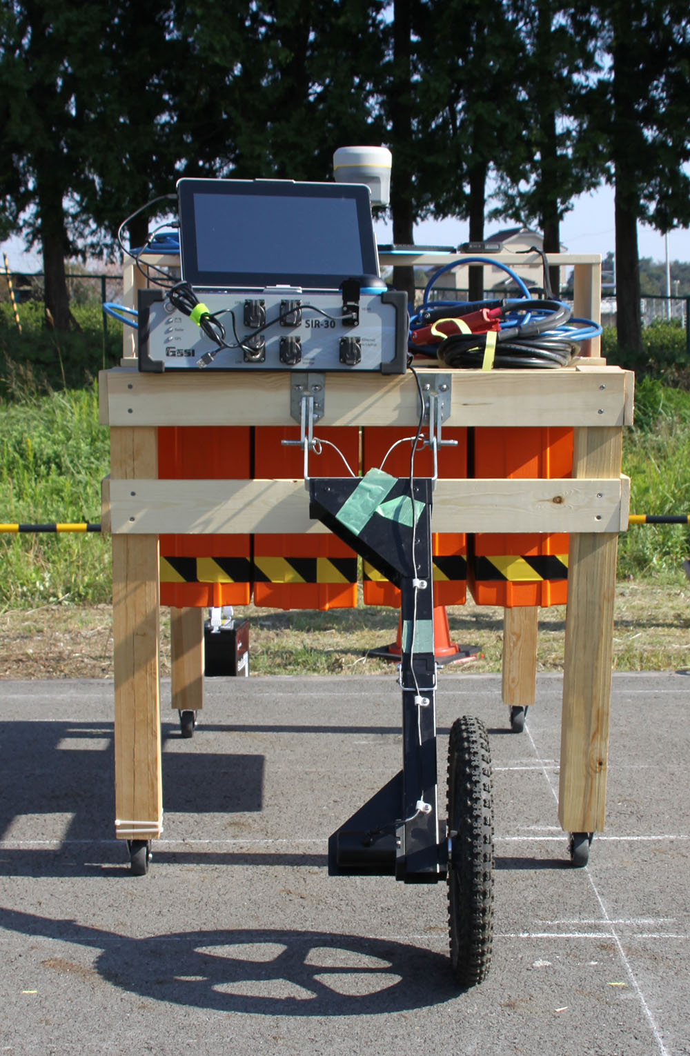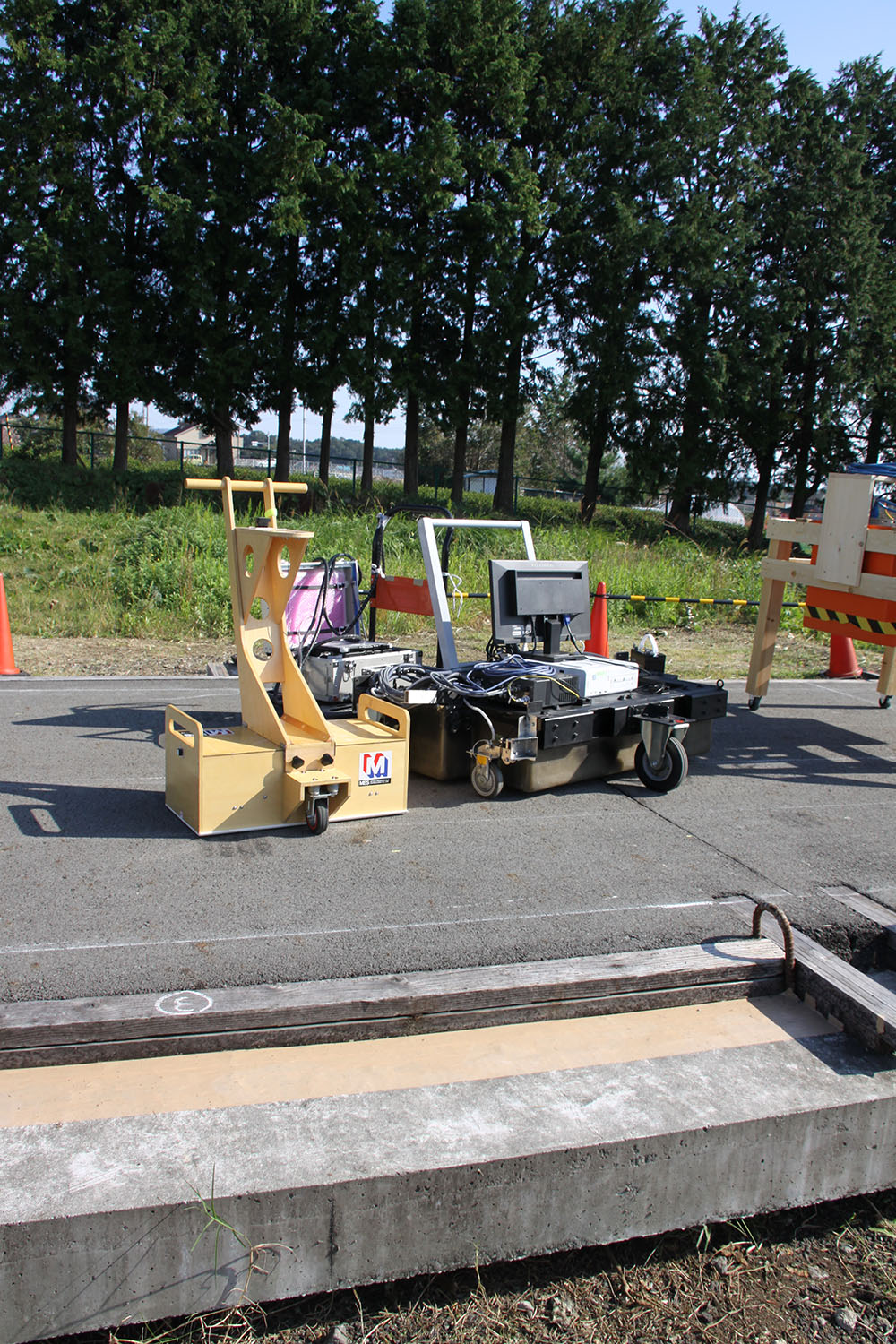 手押しタイプの「MPLA10GI」も開発、市販化しており、周波数帯で言えば100MHz~10GHz帯まで扱える。主に床版の上鉄筋のかぶりまでを詳細に調べることができる。車載タイプは横断方向7センチ間隔を12測線で図ることが可能。MPLA10GIは、11mmの間隔で256側線を測定可能だ。