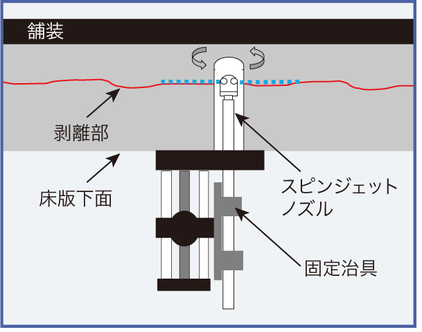 スピンジェットノズルは、ヘッドの高圧水射出口(ノズル)を複数、水平方向に配置しノズルを高速回転させながら水を射出することで、最小0.1mm幅のひび割れや剥離面にあるノロなど堆積物を取り除く装置である(右図)。ひび割れや剥離位置は先述した通り、Single i 工法で床版下面から位置を確認し、その位置に床版下面からφ32mmの孔を千鳥配置で穿孔し、そこに装置を差し込み、治具で固定した後に施工する。1孔平均で半径500mmの範囲の不純物を除去することが可能。除去の確認は排出