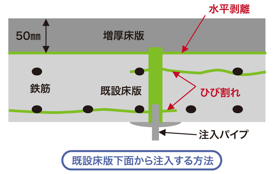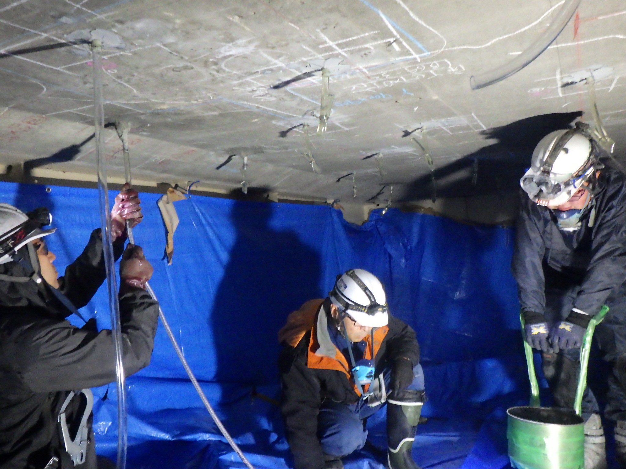 その後、床版下面の同じ穴から水中硬化型エポキシ樹脂(今回は、コニシ製『ボンド E 2601』)を低圧注入する。同樹脂は水中硬化型のため、通常の樹脂より乾燥養生に要する時間を短くできる。最小0.1mm~最大10mmのひび割れ幅に充填することが可能だ。ノロなど不純物の除去率を大幅に改善しているため、樹脂接着面積も高まっており、7割以上の充填率が期待できるため、「少なくとも10年以上の耐久性が期待でき、床版取替までの時間を稼ぐことが可能になる」(同)ということだ。