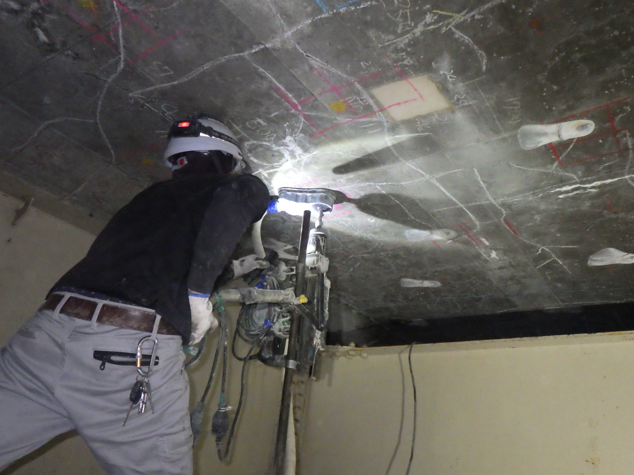 される水の色の変化(不純物が混ざっている場合は乳濁食で徐々に無色透明に変わっていく)で確認する。課題となるのは水の処理だ。上部へのしみ出しは、「増厚界面より上にノズルを出さず、水平方面にしか水を射出しないことから生じない」(NEXCO西日本)としている。また、同システムは水圧100MPa、水量37l/毎分のポンプを使っている。下は供用している鉄道のため、水を外部に漏らすことは厳禁だ。そのため、射出する孔の直下にはバキュームを配置して水を吸い取るとともに、他の予め穿孔された孔から出た水は、下に配置した桶で受け止める。さらに足場内は防炎シートと養生シートで二重防護し、水の外への漏れ出しを防止している。