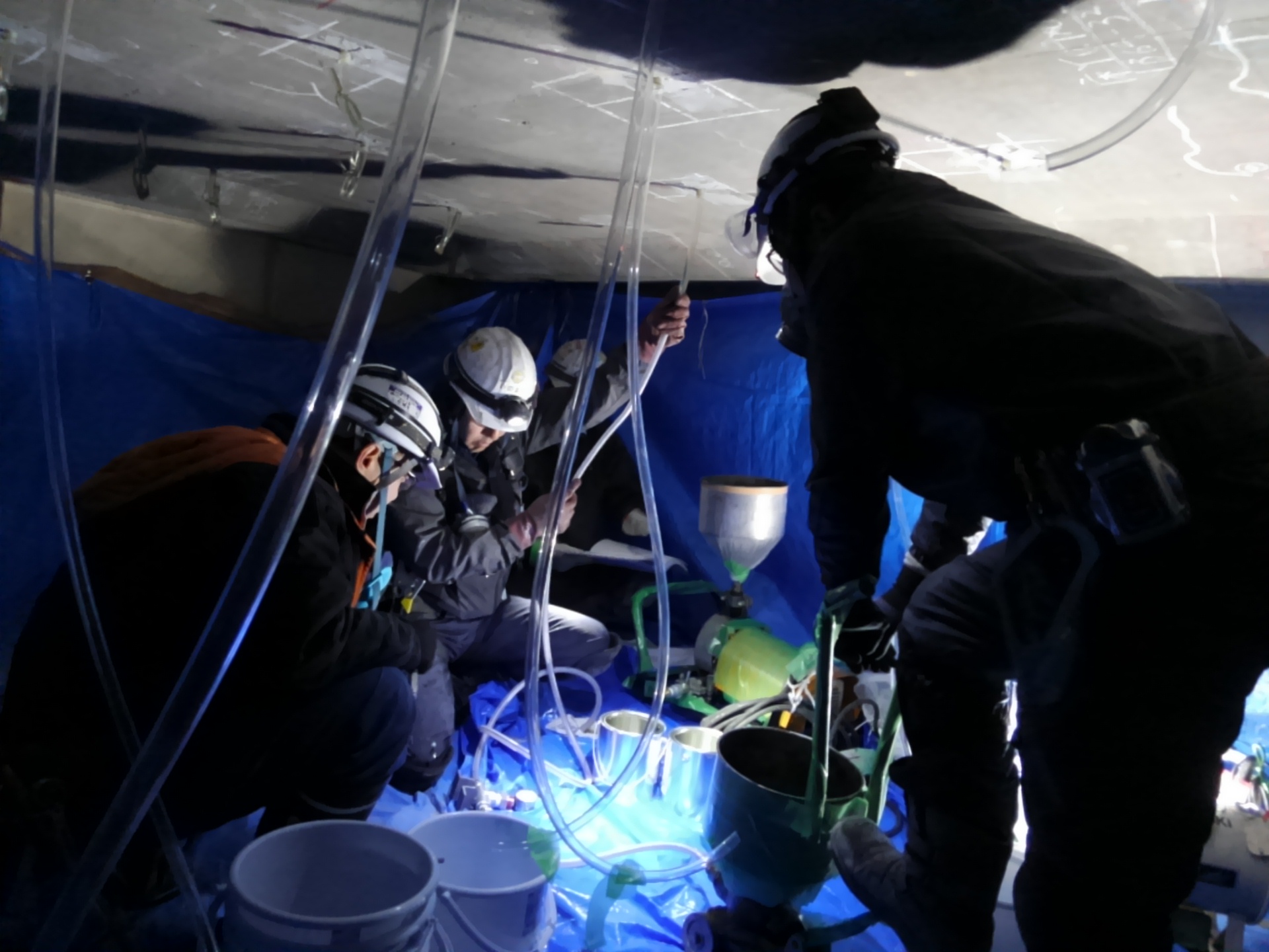 施工人員および1日当たり施工面積は、スピンジェットノズルで1班6人、30㎡。低圧樹脂注入が1班5人、100㎡。先行して内部を洗浄し、ある程度進んだのちに樹脂注入を行うという手順となる。