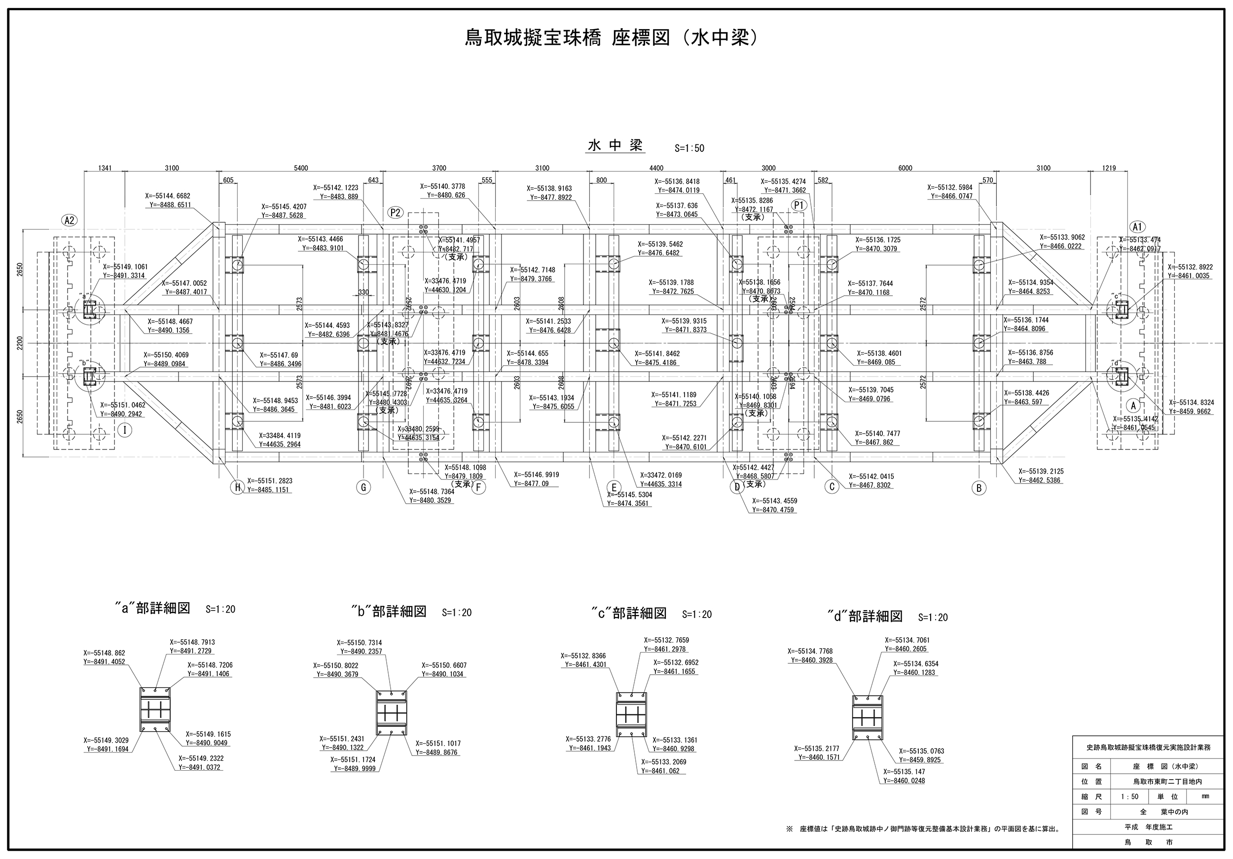 水中梁と木造橋の橋脚との接続は、工場で一体製作をした高さ50cmの張出ブラケット(二相ステンレス鋼)を横桁から上面と同じ高さで設置して行った。堀底に接しない張出ブラケットとすることで、橋脚遺構を保全することができると同時に、正確な位置での橋脚復元も可能となった。また、水中梁が遺構と接してしまう箇所は、梁の下部を抉って対応した。