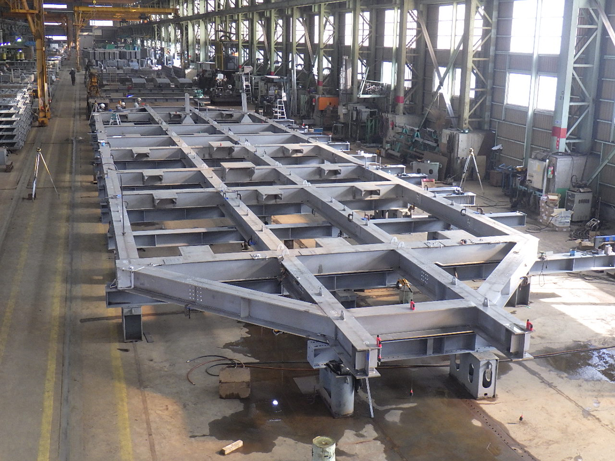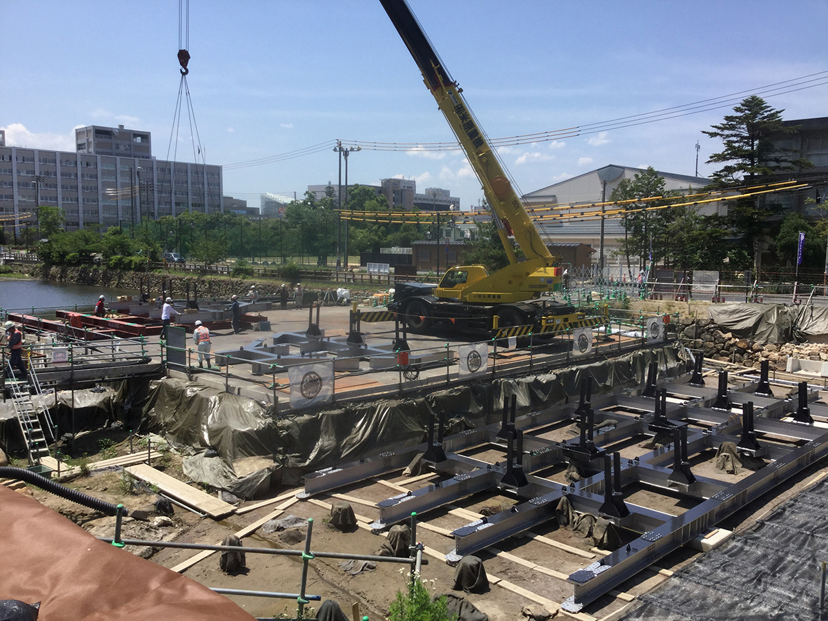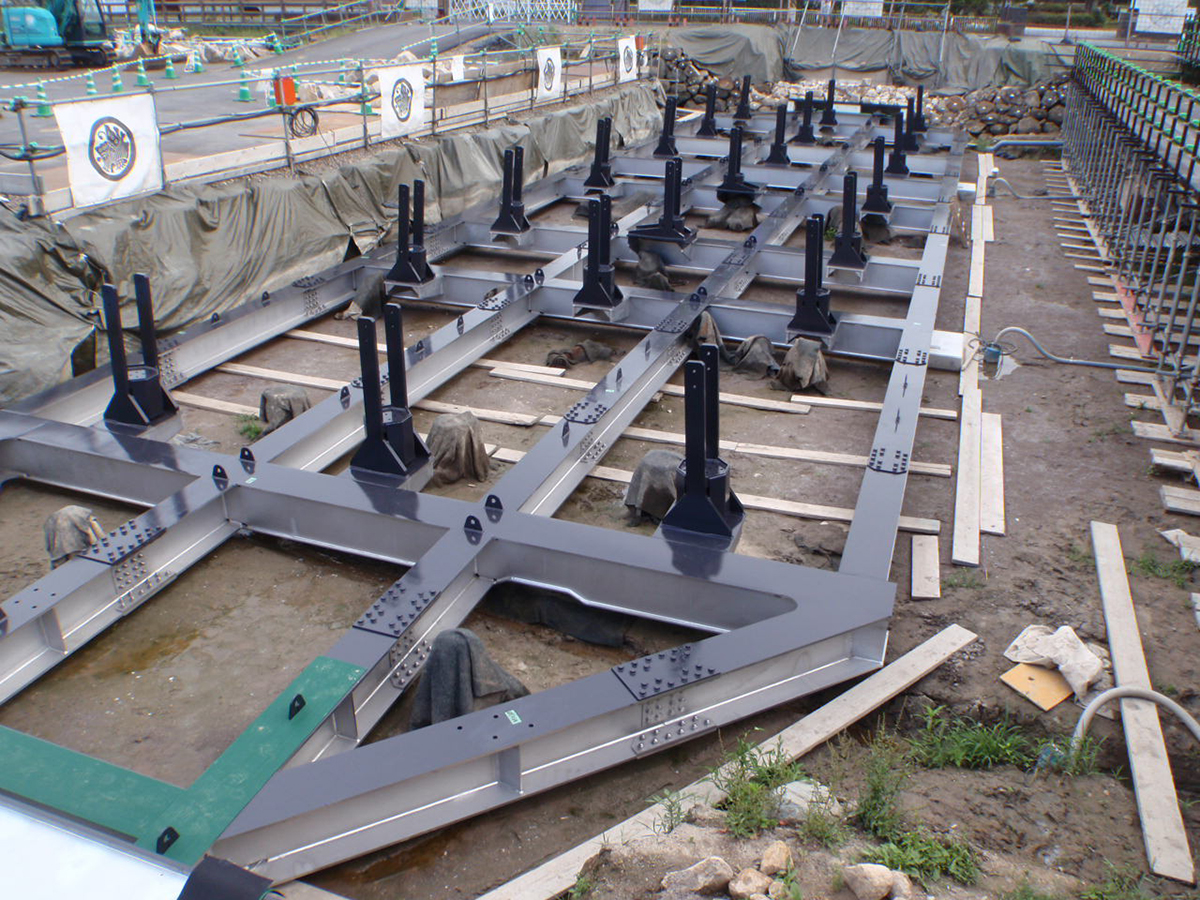 楢崎製作所室蘭工場で製作された/水中梁の架設