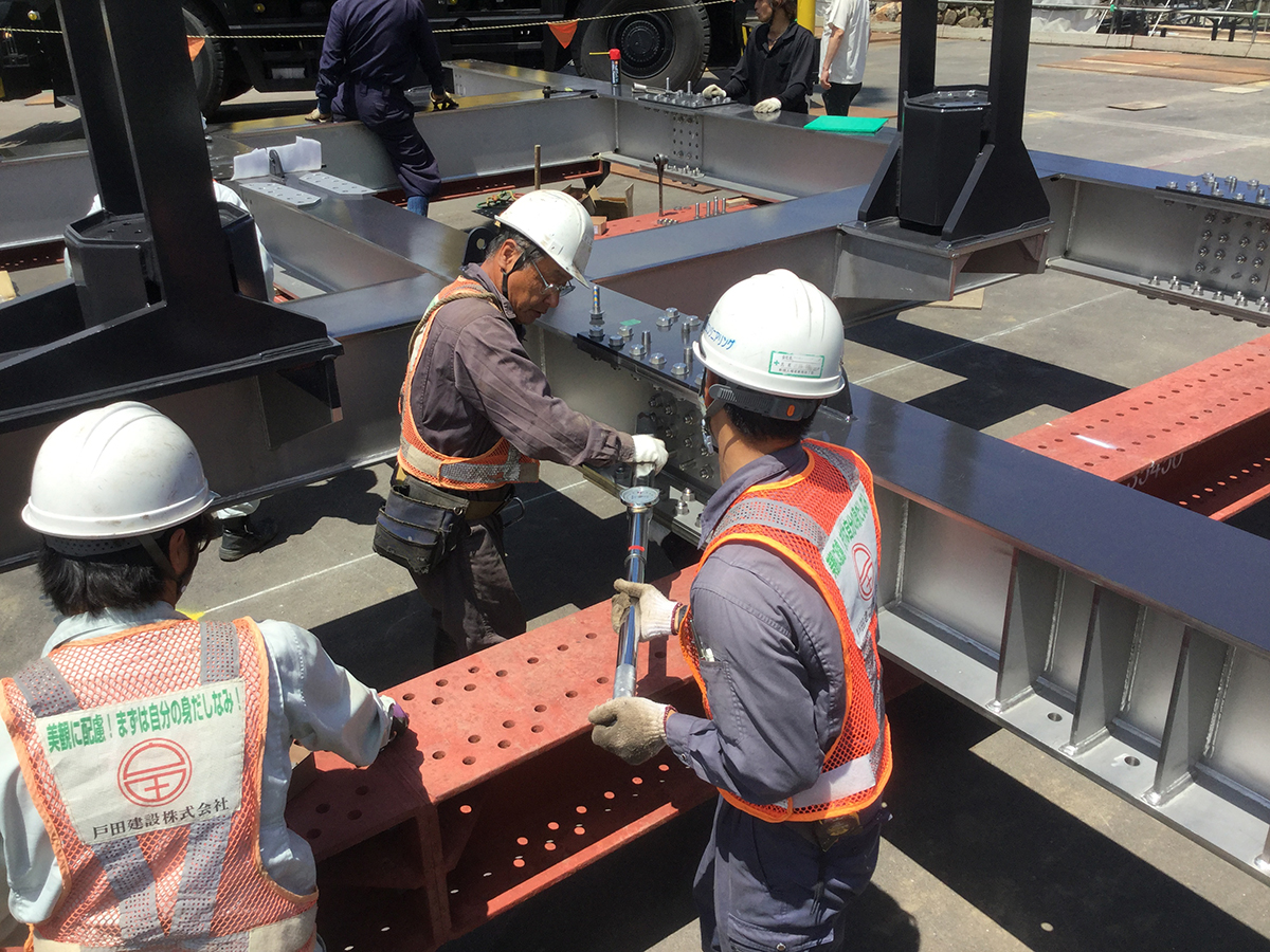 各ブロックの接合は、二相ステンレス鋼を現場溶接できる技術者の確保が難しかったこともあり、ボルト接合としている。しかし、「上面塗装を行ったことにより、上面と下面で温度差が出て、水中梁にねじれが生じてしまい、ボルト接合が大変だった」(元請の戸田建設)という。