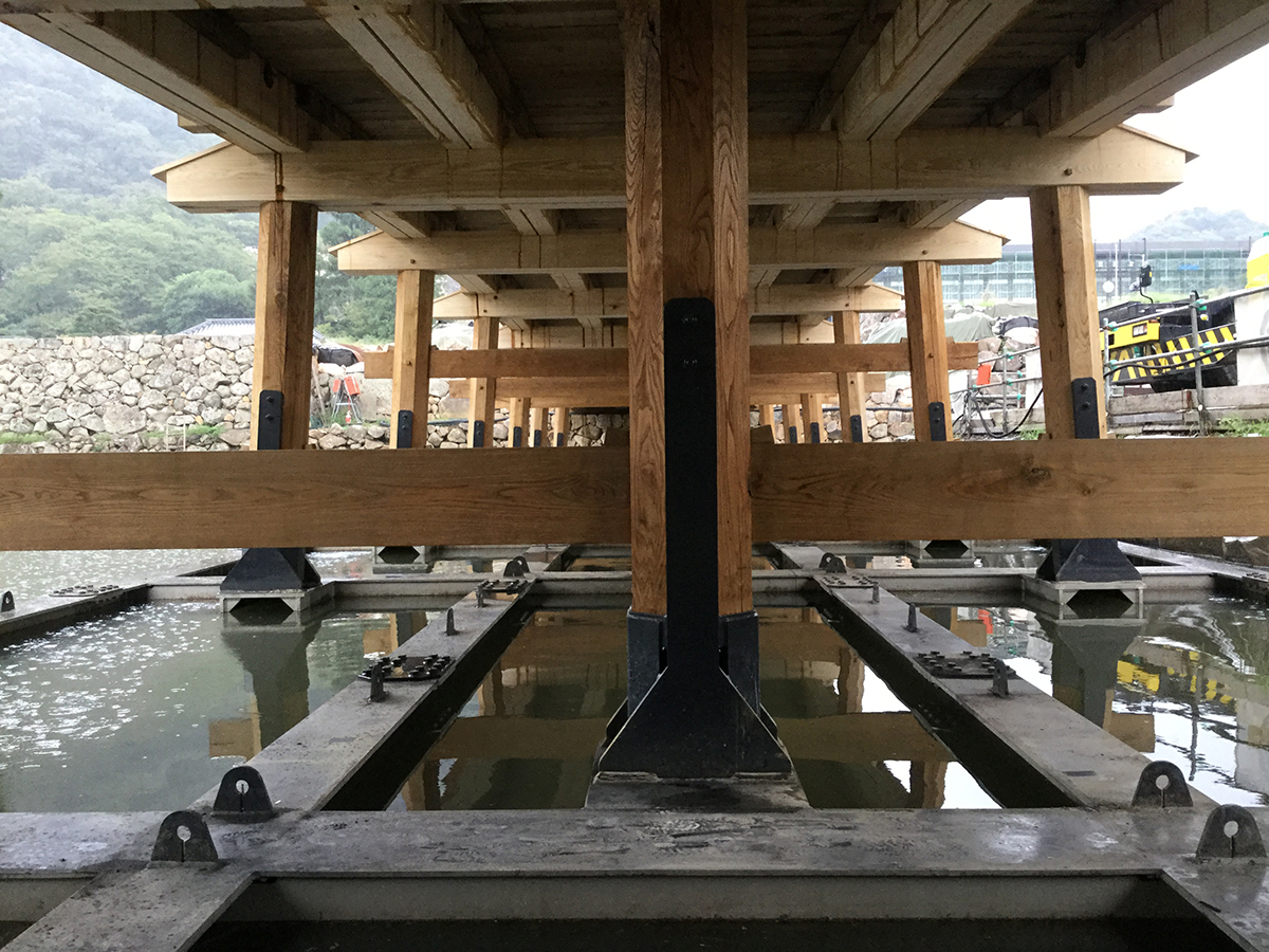 水中梁上面には黒塗装を行った。張出ブラケットにより、水中梁と木造橋橋脚を接続