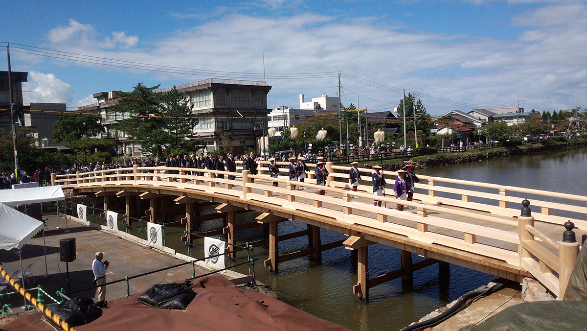 木造橋は、橋脚と床板が岩手県南部地方産の栗材、桁と高欄が静岡県天竜地区を主としたひのき材で、両方とも樹齢100年程度のものを使用している。約26カ月の工期のうち、木材の自然乾燥に約1年間をかけているが、水分を含んだ状態でいきなり最終加工をすると割れが発生するため、乾燥状態を確認しながら、一次製材と二次製材を行ったためだ。最終的には約80cmの丸太が最大で36cmの角材となった。