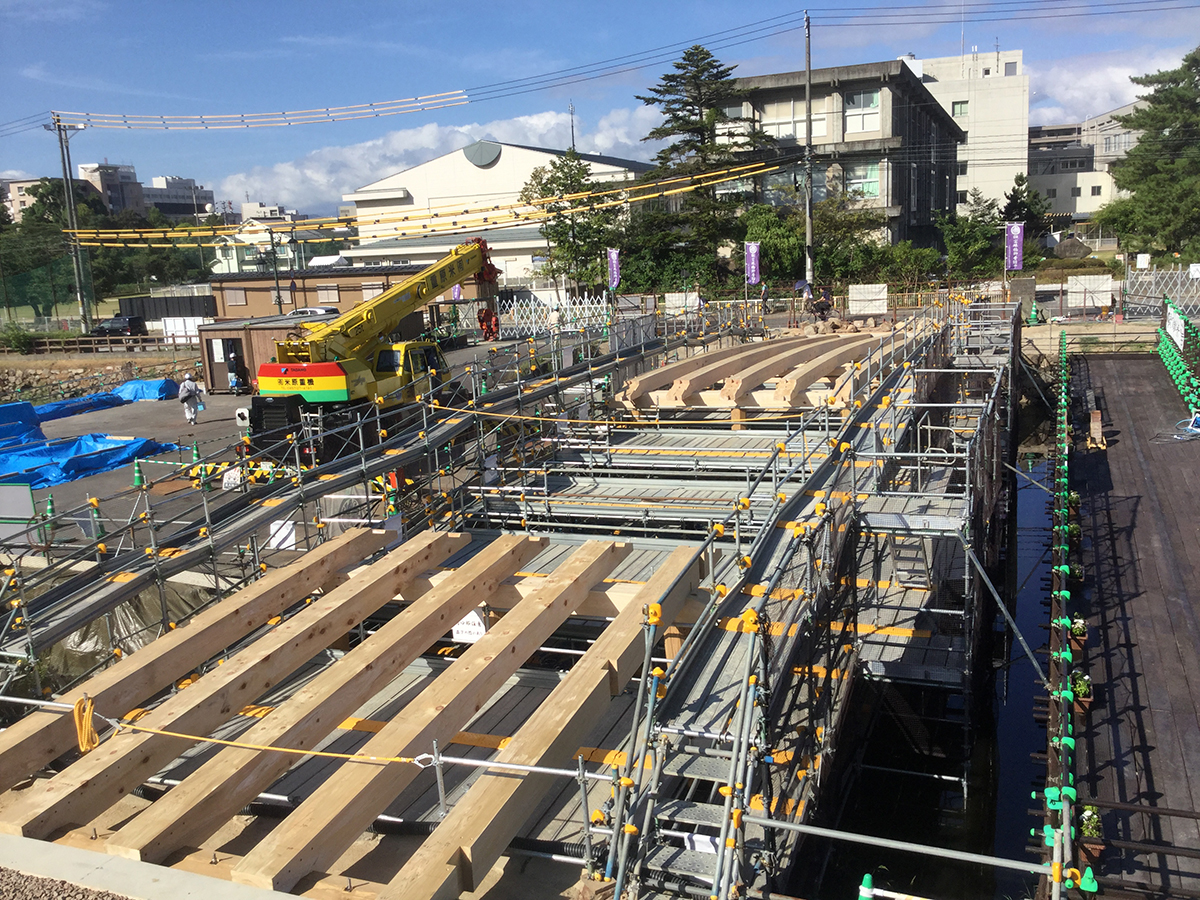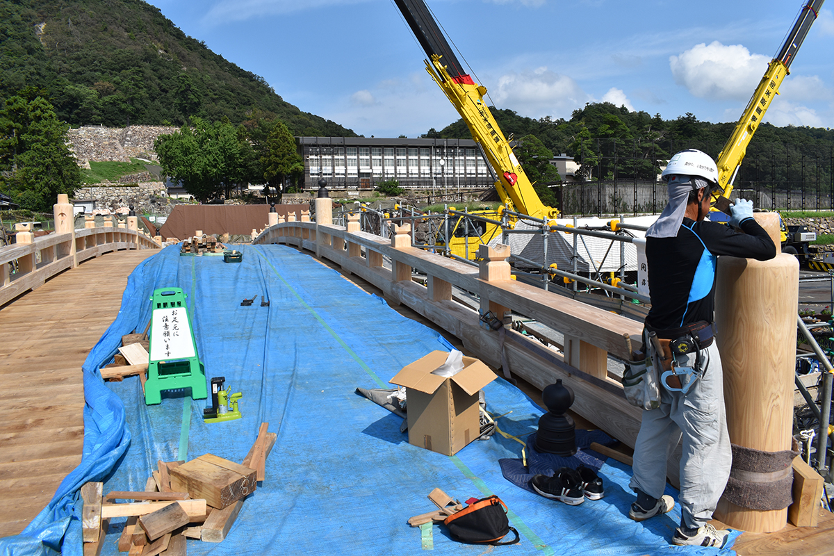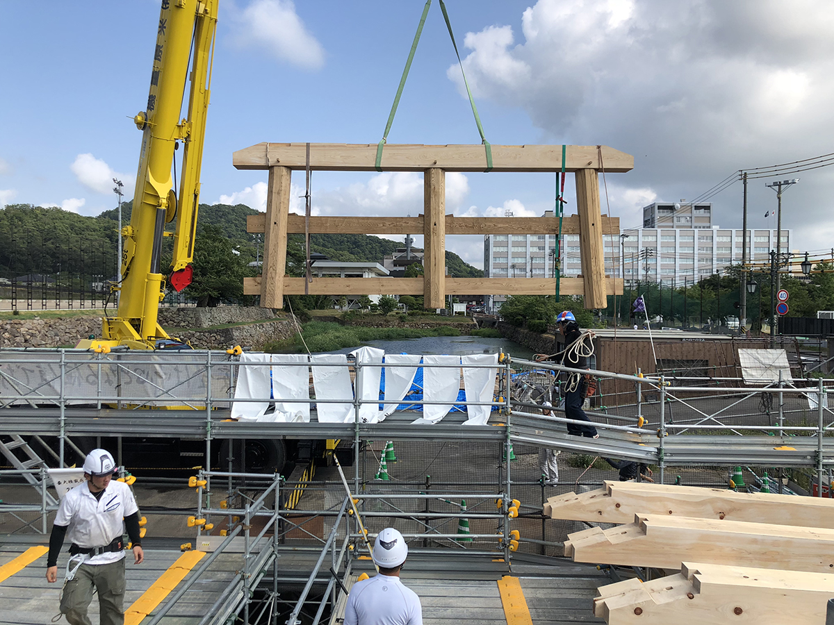 同兵庫工場で桁から上の仮組み立てを実施後、2018年8月2日から現地での組み立てに入っていった。橋台上に枕木を設置した後に、仮設ヤードで鳥居形に組み上げた橋脚、貫(橋脚3本をつなぐ横材)と横桁をクレーンで吊り上げて設置した。鳥居形の橋脚、貫と横桁の最大重量は約1.2tあるが、釘やボルトは使用せず、伝統木工の込栓(こみせん)と楔のみの固定で吊り上げを可能として、7組を両橋台側から施工していった。支間長は最長で6.187m、最短で3.121mと各支間バラバラだが、復元対象となった橋がもともとそのような支間長だった。