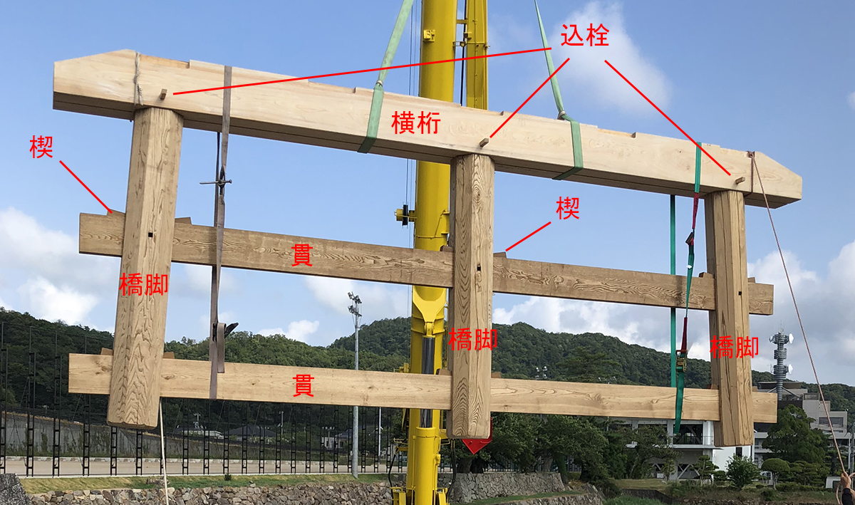 橋脚、貫、横桁を鳥居型に組み上げ、架設した/部材の名称(文化財保存計画協会提供)