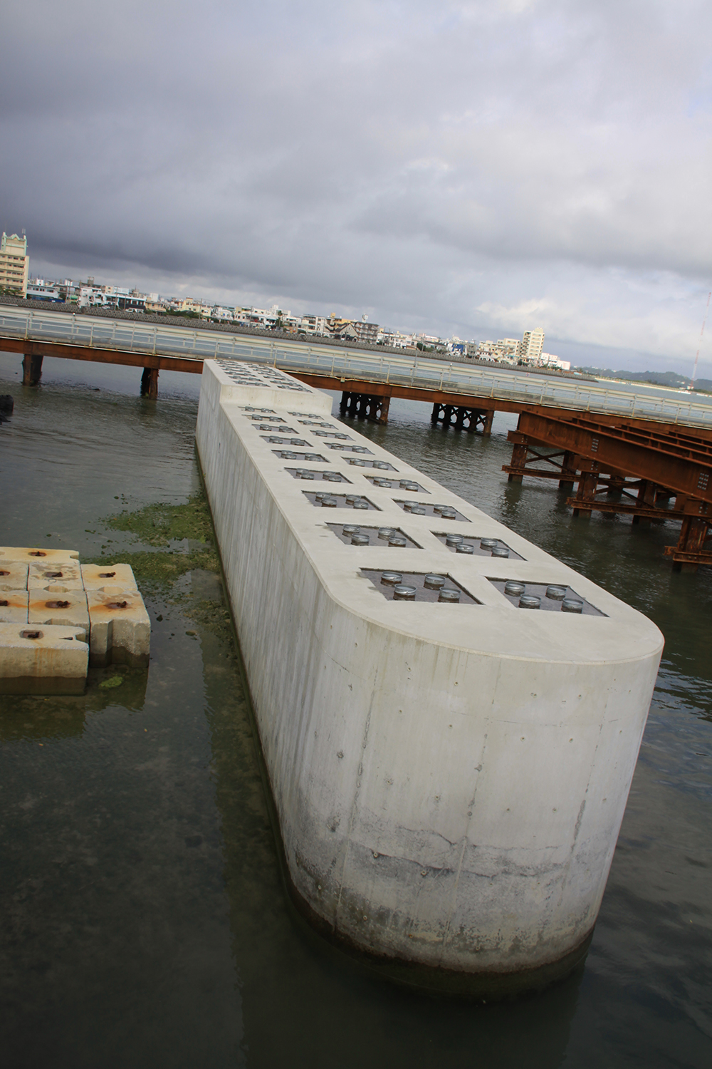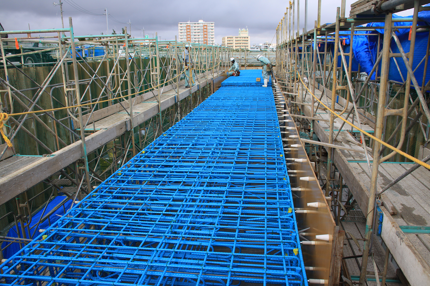 塩害対策としては、エポキシ樹脂塗装鉄筋、エポキシ樹脂被覆PC鋼より線、ASR対策および砕砂100%のコンクリートのワーカビリティー改善を目的に、FAを外割で細骨材(砕砂)の3~5%程度に置き換えるなど伊良部大橋の塩害対策を踏襲している。伊良部大橋のように隅角部にCFCC(炭素繊維ケーブル)のひび割れ防止用メッシュを入れるかどうかは検討中だ。