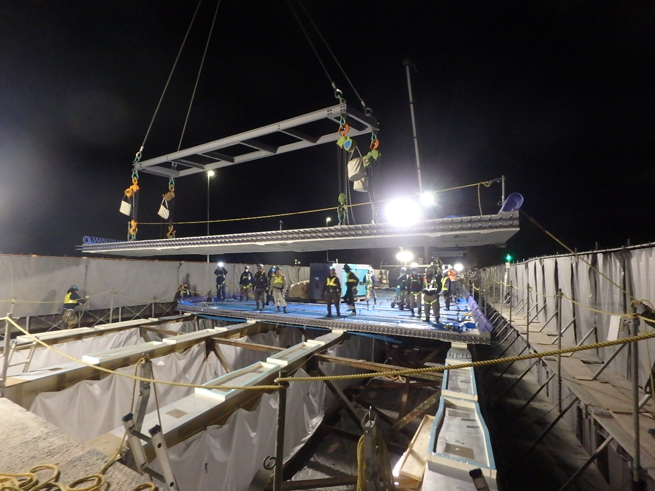 工程は昼間に高欄・床版の切断や撤去、既存スタッドの溶断や上フランジのケレンなど音の出る作業を行い、夜間に床版パネルを架設する。