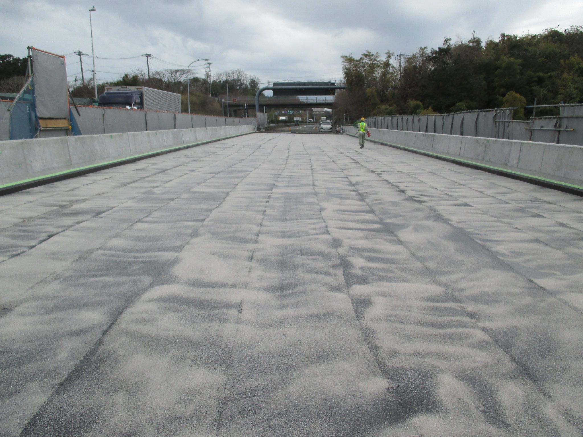 床版防水は高性能床版防水(グレードⅡ)「HQハイブレンAU」を1598.8㎡に施工する。次いで基層にFB13(40mm)、表層に高機能舗装Ⅰ型(40mm)を打設する。床版防水は研掃、防水に各1日、舗装は表層基層に各1日と計4日間で舗装および防水工の施工を終えた。