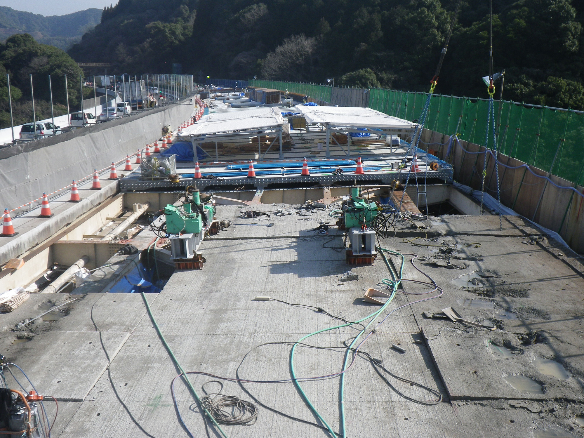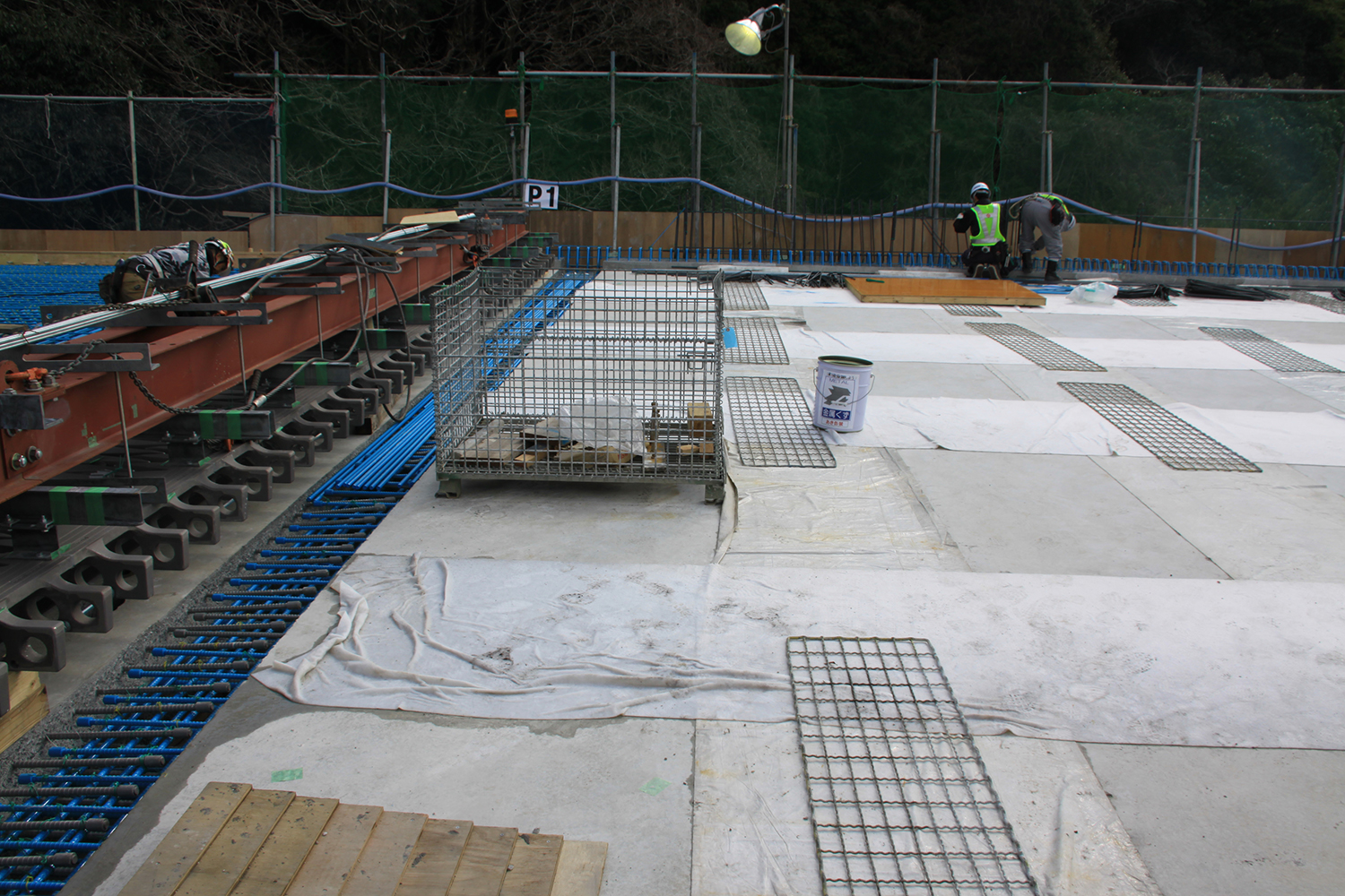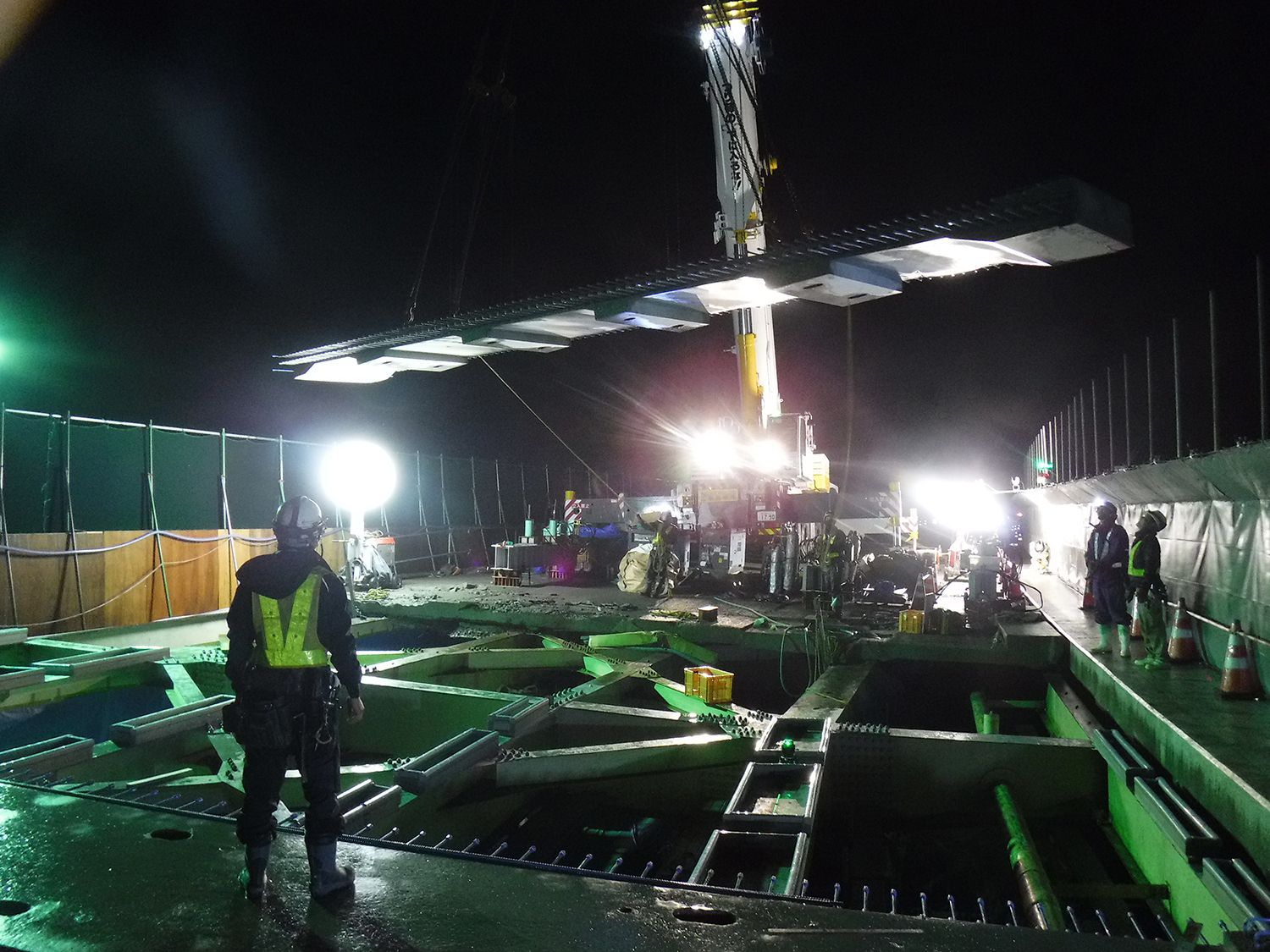 合成桁部は、フランジ上のコンクリートを残す形で既設床版を切断し撤去した。次いでフランジ上面のコンクリートは手斫りなどを用いて除去した。これは合成桁であることを考慮したもので、スタッドジベルが中に埋まっているため通常のジャッキアップで床版を撤去しようとすると桁の変形を招くため、フランジ上面のコンクリートを後追いで斫り取っている。もちろん施工時にひずみ計測や床版設置高のキャリブレーションを行っており、プレキャストPC床版パネルを設置し終えた際にキャンバーが戻るよう慎重に施工している。