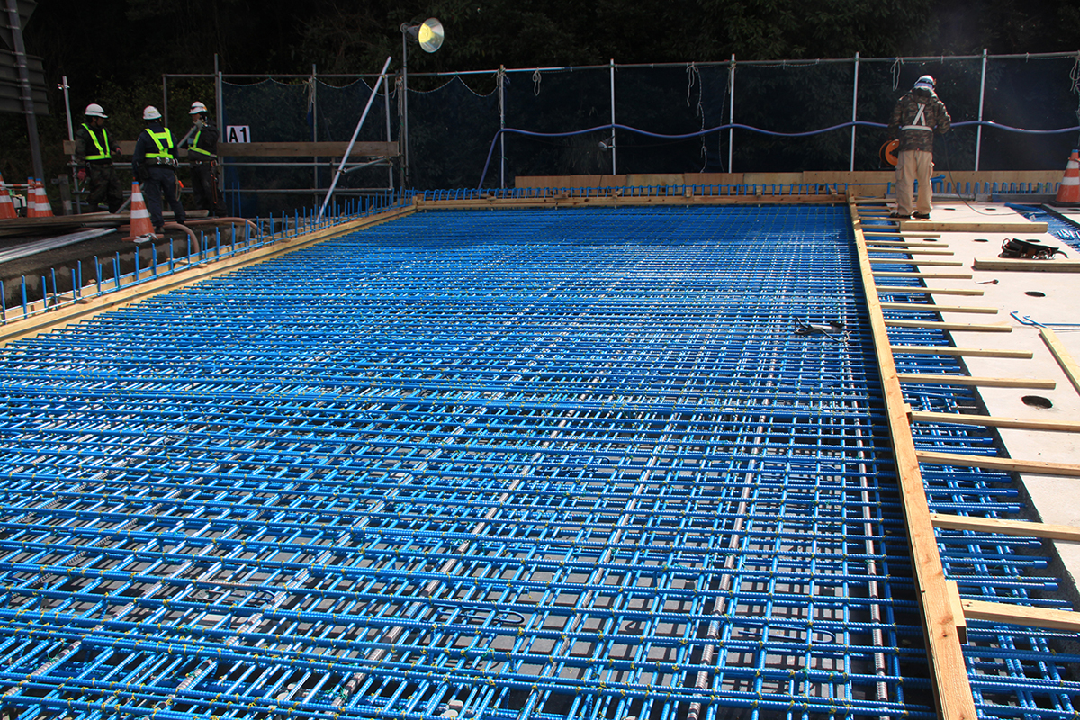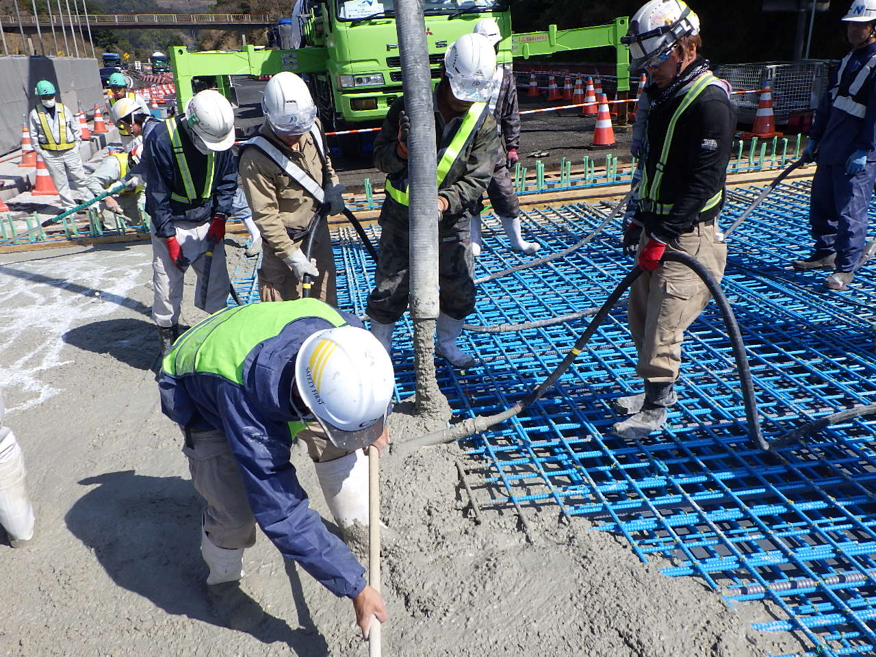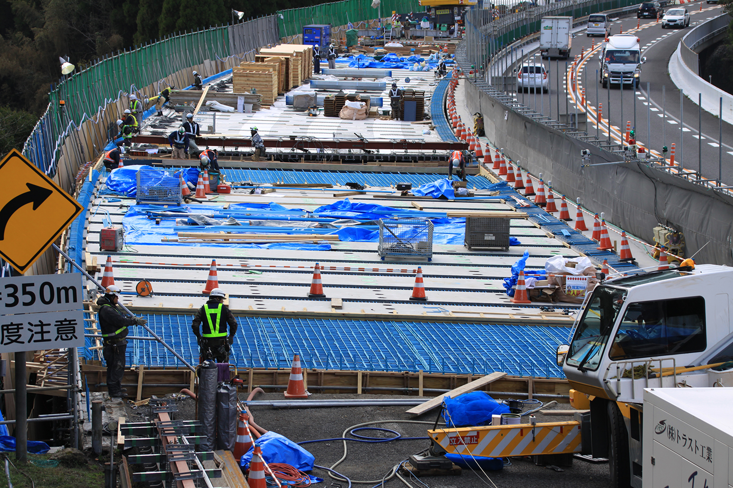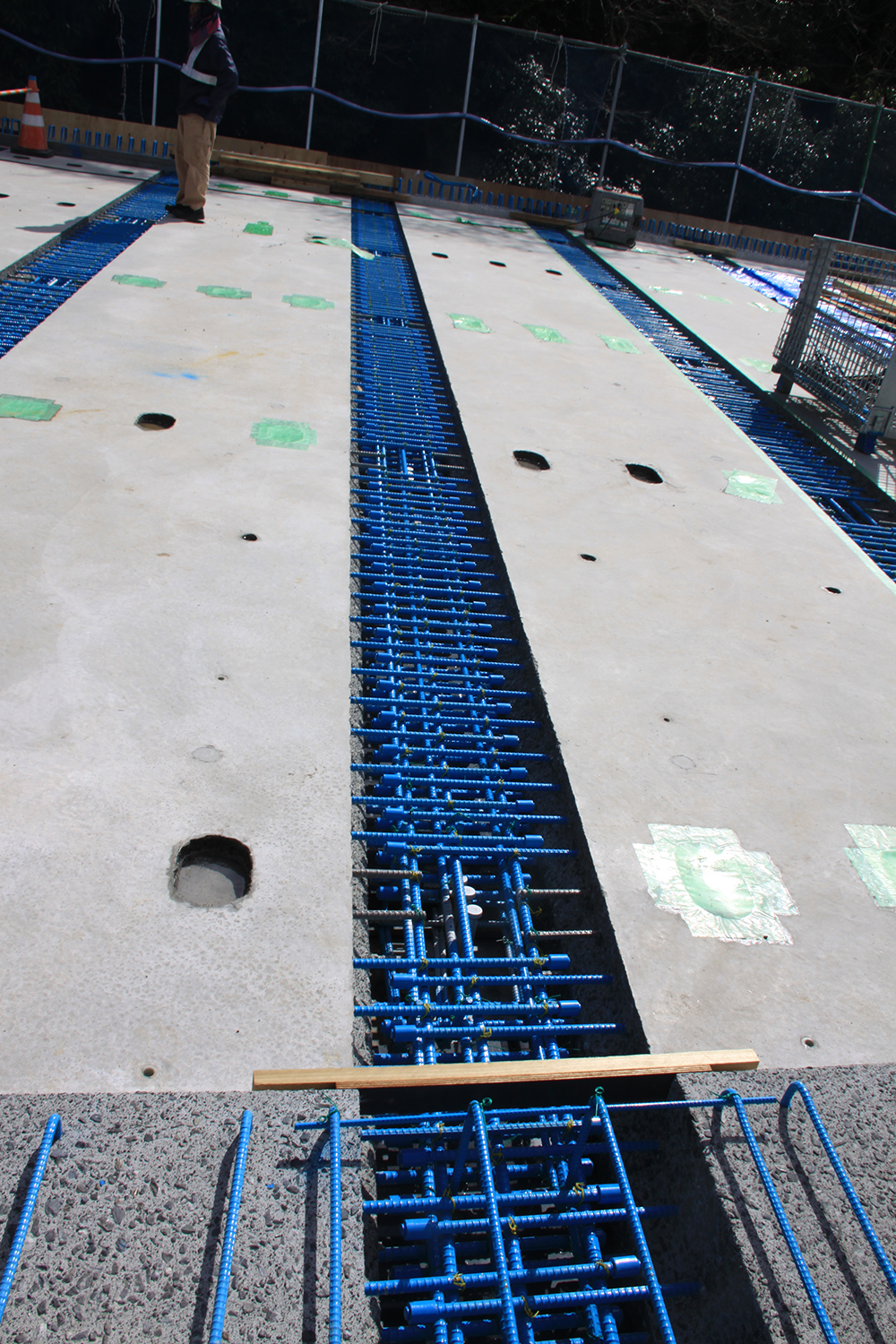 合成桁部は、フランジ上のコンクリートを残す形で既設床版を切断し撤去した。次いでフランジ上面のコンクリートは手斫りなどを用いて除去した。これは合成桁であることを考慮したもので、スタッドジベルが中に埋まっているため通常のジャッキアップで床版を撤去しようとすると桁の変形を招くため、フランジ上面のコンクリートを後追いで斫り取っている。もちろん施工時にひずみ計測や床版設置高のキャリブレーションを行っており、プレキャストPC床版パネルを設置し終えた際にキャンバーが戻るよう慎重に施工している。